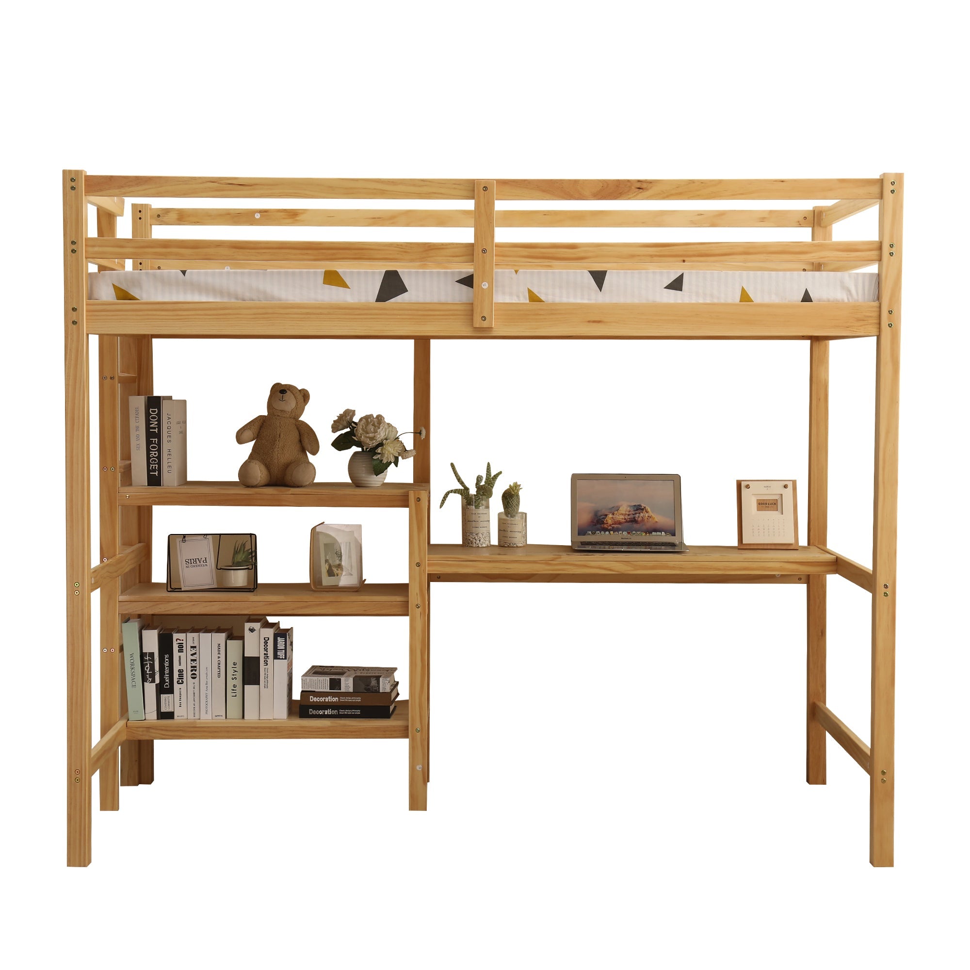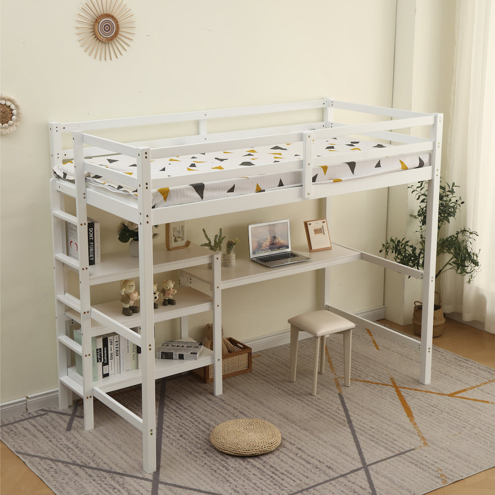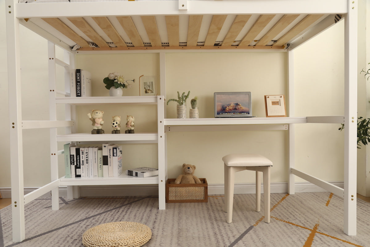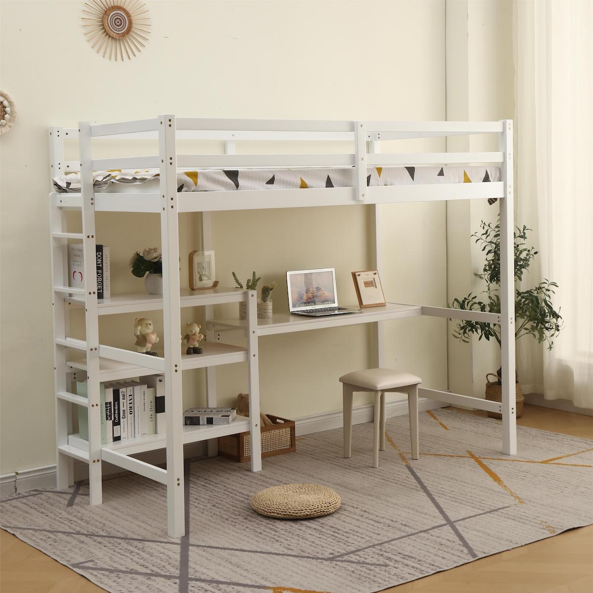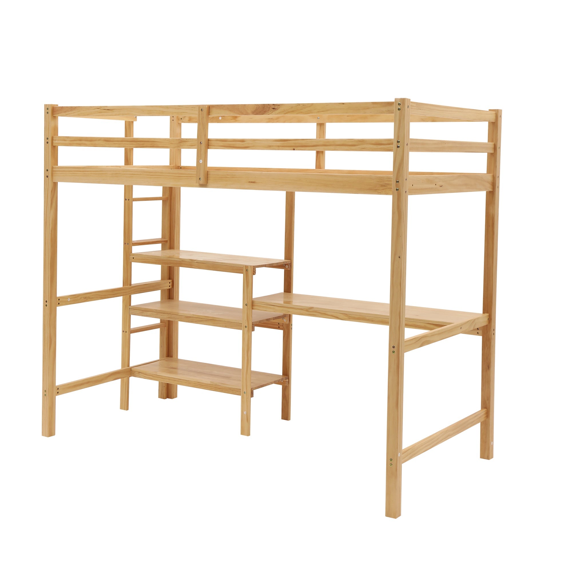 木製デスク付きロフトベッドは、限られたスペースを最大限に活用するための理想的なソリューションです。学生や一人暮らしの方に最適で、成長期の子供にもぴったりです。多機能デザインでベッドとデスクが一体化し、ナチュラルとホワイトの2色展開でどんなインテリアにも調和します。ニュージーランドパインを使用した耐久性のある構造で、150kgまでの耐荷重を実現。安全性も考慮され、高いベッドガードと通気性に優れた床板構造で安心してご利用いただけます。デスク下の広々とした収納スペースで整理整頓も簡単。131.5cmの高さがあり、プライベート空間を確保できます。