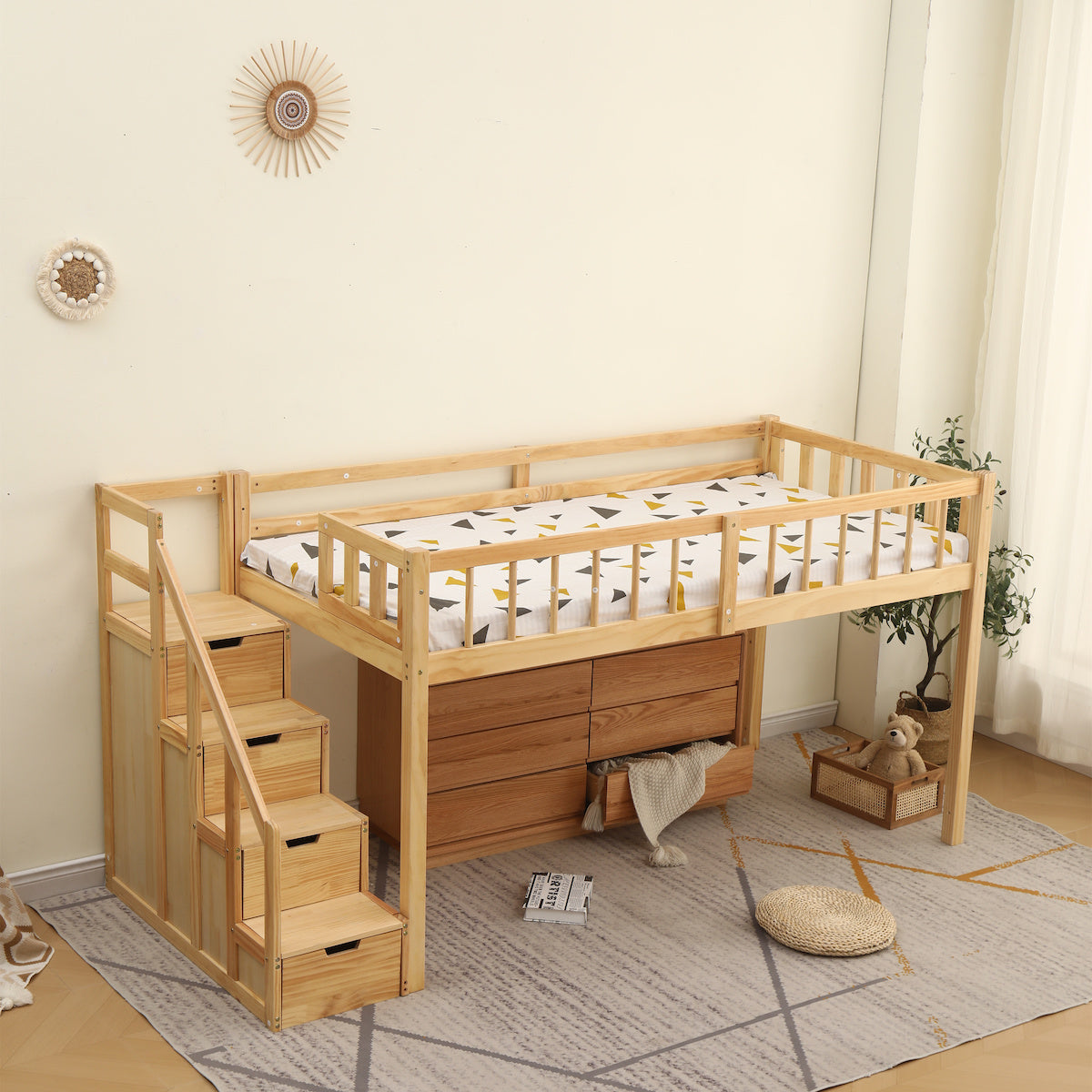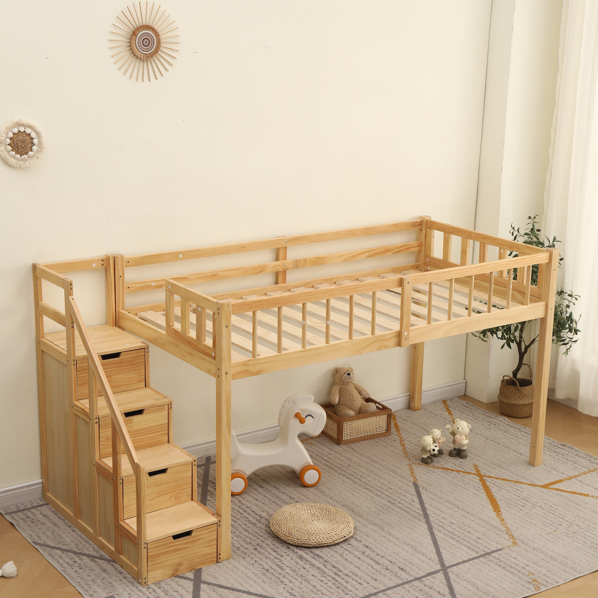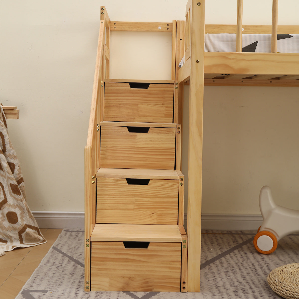 階段付き木製ロフトベッドは、限られたスペースを最大限に活用できるデザインが特徴です。収納機能付きの階段や高い安全性、耐久性に優れたニュージーランド産パイン材を使用し、150kgの耐荷重を誇ります。シンプルで洗練されたデザインは、ナチュラルとホワイトの2色展開で、どんなインテリアにも調和します。通気性の良い構造で湿気がこもりにくく、子供から大人まで安心して使用できる機能的なベッドです。ワンルームや限られたスペースに最適で、家庭や学生、社員寮としても理想的です。