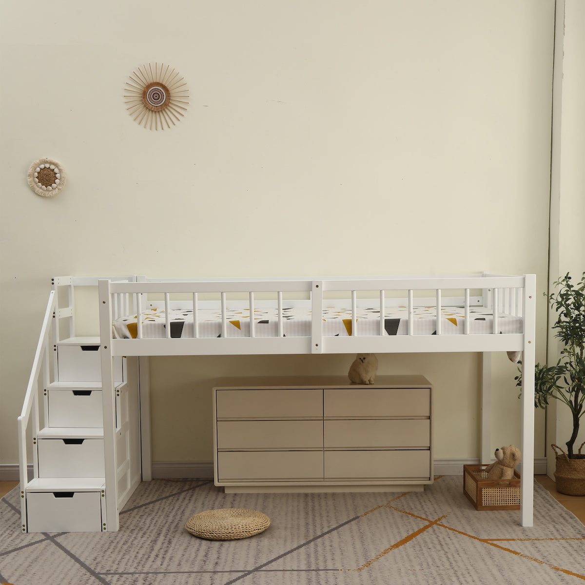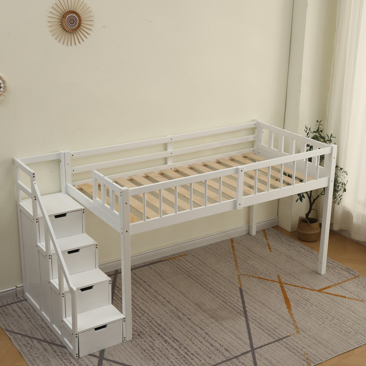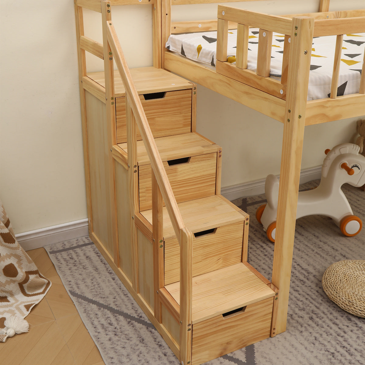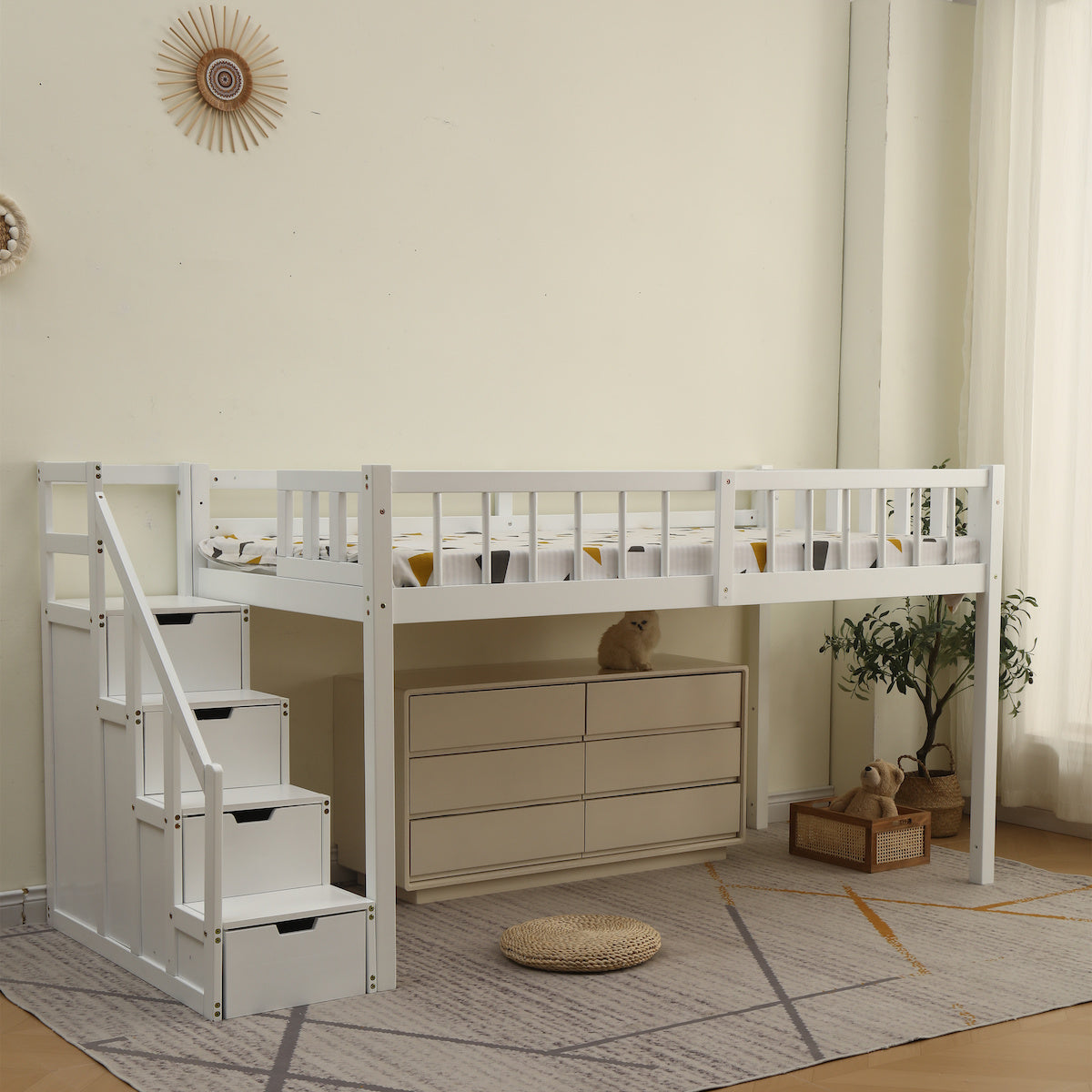 階段付き木製ロフトベッドは、限られたスペースを最大限に活用できるデザインが特徴です。収納機能付きの階段や高い安全性、耐久性に優れたニュージーランド産パイン材を使用し、150kgの耐荷重を誇ります。シンプルで洗練されたデザインは、ナチュラルとホワイトの2色展開で、どんなインテリアにも調和します。通気性の良い構造で湿気がこもりにくく、子供から大人まで安心して使用できる機能的なベッドです。ワンルームや限られたスペースに最適で、家庭や学生、社員寮としても理想的です。