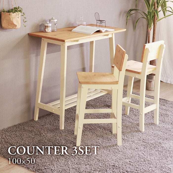 ヴィンテージ調パイン材無垢天然オイル塗装カウンターテーブル3点セット(幅100cmテーブル+チェア2脚)