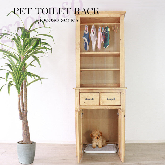 カントリーパイン材無垢ペットトイレ収納ラックは、北欧のパイン材を使用したクラシカルなデザインが特徴です。ペット用のトイレを収納するスペースがあり、生活感を隠すことができます。上部のポールハンガーでペットの洋服を掛けることができ、下部にはトイレを置けるスペースがあります。ライトブラウンとホワイトの2色展開で、インテリアに合わせて選べます。水性塗料を使用し、環境に優しい仕上がりです。