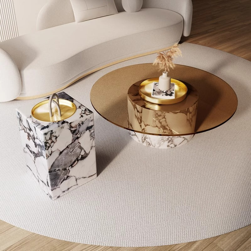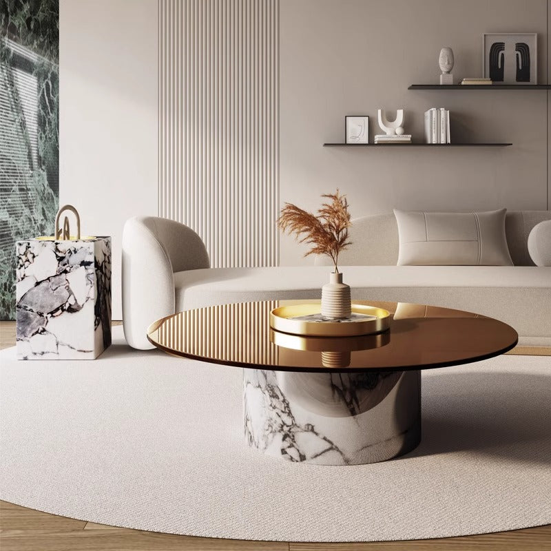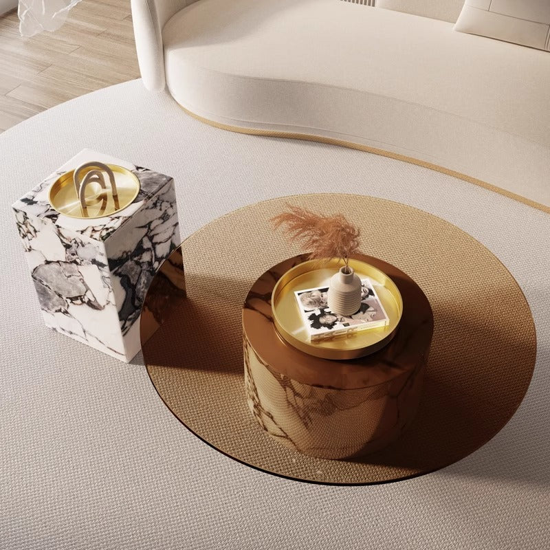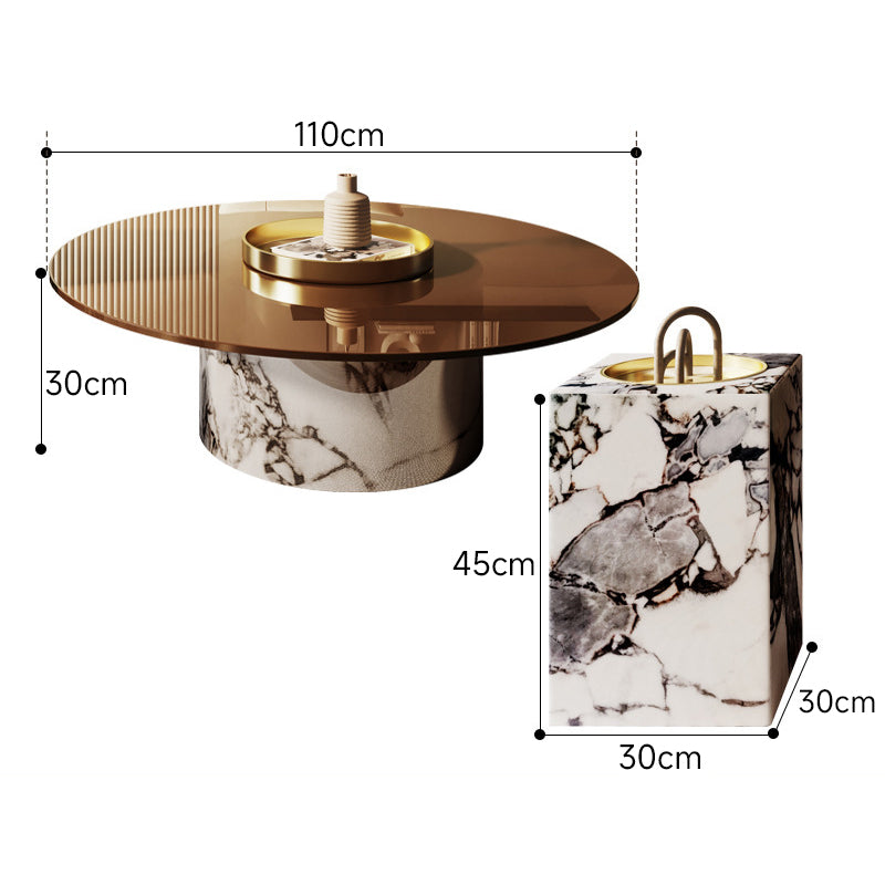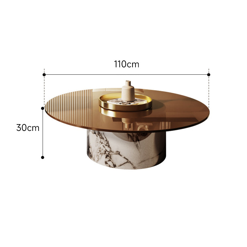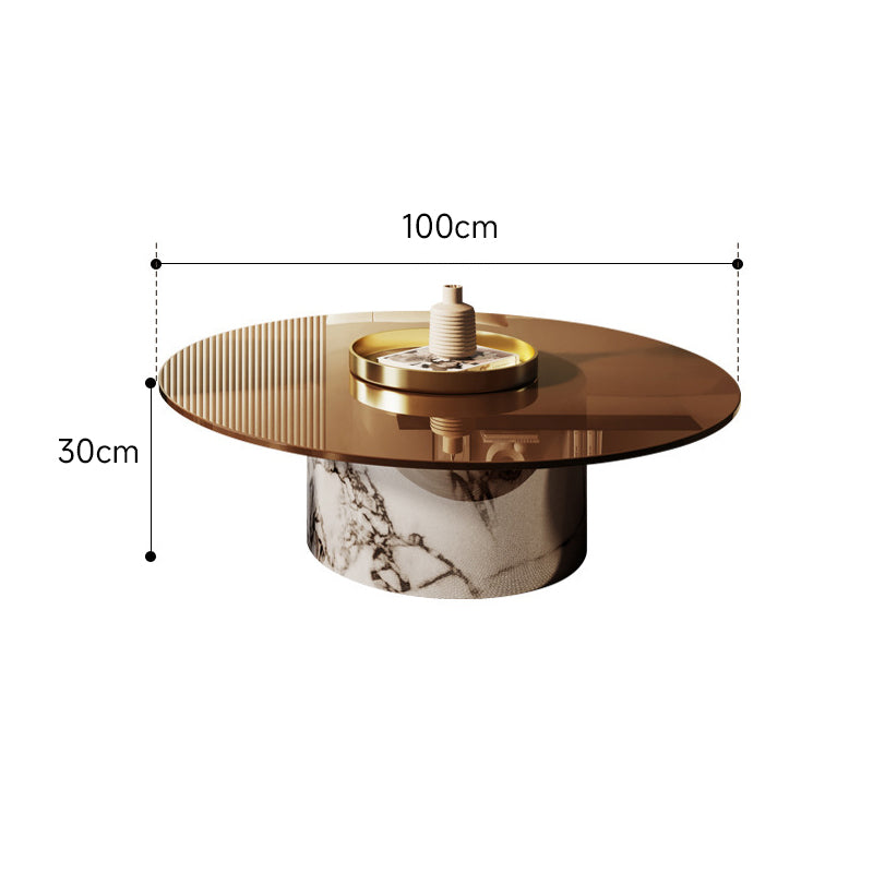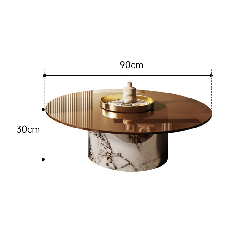 マーブルガラステーブルは、洗練されたデザインと高品質な素材を組み合わせたモダンでエレガントな家具です。強化ガラス天板は衝撃や熱に強く、光沢のある仕上げが高級感を演出します。チタンコートトレイはお手入れが簡単で耐久性が高く、大理石調のベースがインテリアに自然な美しさを加えます。丸みのあるエッジデザインで安全性も考慮されています。直径80cmから120cmまでのサイズバリエーションがあり、どんな空間にもぴったりです。