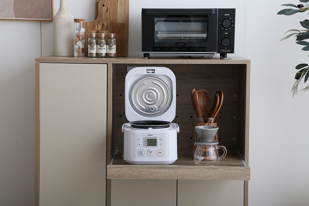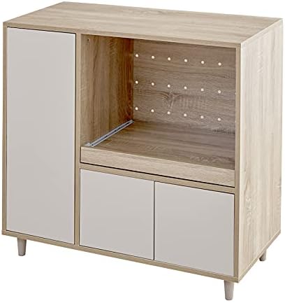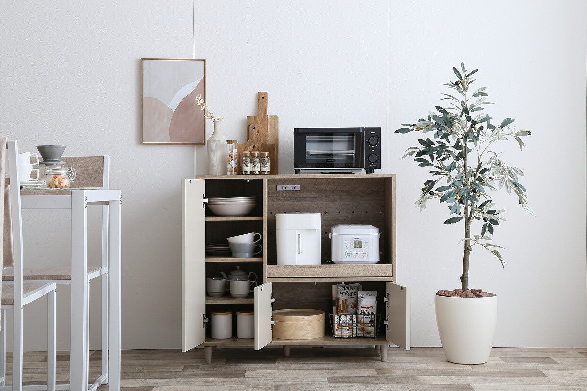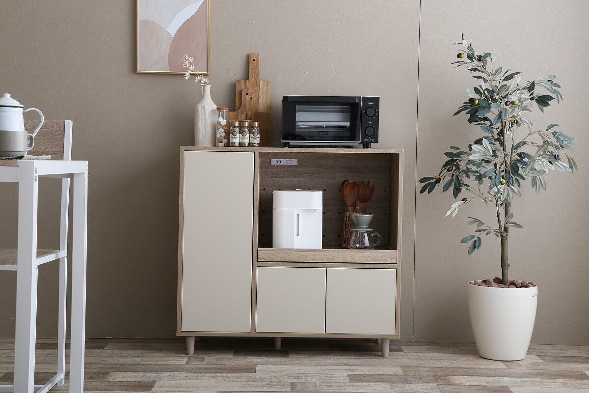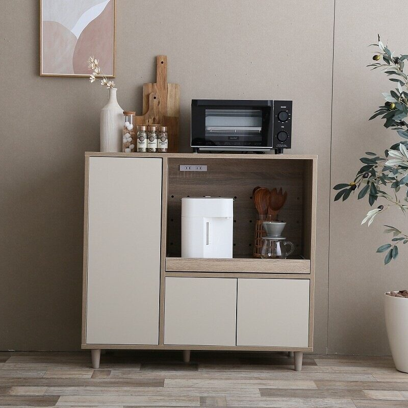 木目調バイカラーレンジ台は、シンプルでスタイリッシュなデザインが特徴のキッチン収納家具です。ナチュラルな木目調と落ち着いたバイカラーの組み合わせが、どんなインテリアにもマッチします。幅86cm、高さ81cm、奥行39.5cmのコンパクトサイズで、限られたスペースにも設置可能です。上部には電子レンジやオーブントースターを置くスペースがあり、下部には扉付きの収納スペースが3つあります。内部には電源コンセントが設置されており、キッチン家電をすぐに使用できる便利さがあります。耐水性のある素材を使用しており、汚れがついても簡単に拭き取れます。機能性とデザイン性を兼ね備えたこのレンジ台は、キッチンの整理整頓に最適です。