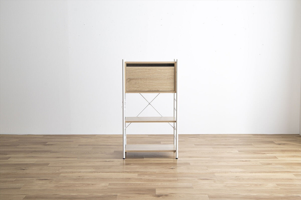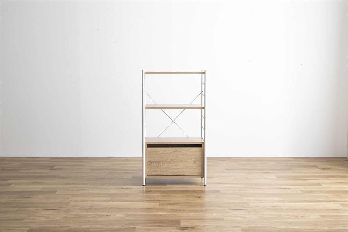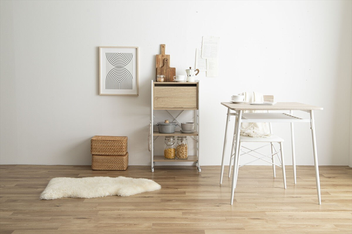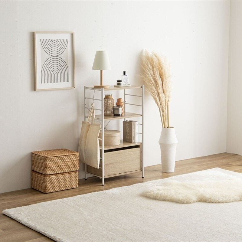北欧引き出し付き幅50cmシェルフは、シンプルで機能的なデザインが特徴の北欧スタイルのシェルフです。幅50cmのコンパクトサイズで、限られたスペースでも活用可能。引き出し付きで小物や雑貨の収納に便利。調整可能な棚は8cm間隔で高さを変えられ、各棚の耐荷重は約10kg。木目調の棚板とスタイリッシュなフレームが北欧風インテリアにぴったり。キャスター付きで移動も簡単。リビング、キッチン、オフィスなど多用途で活用できます。