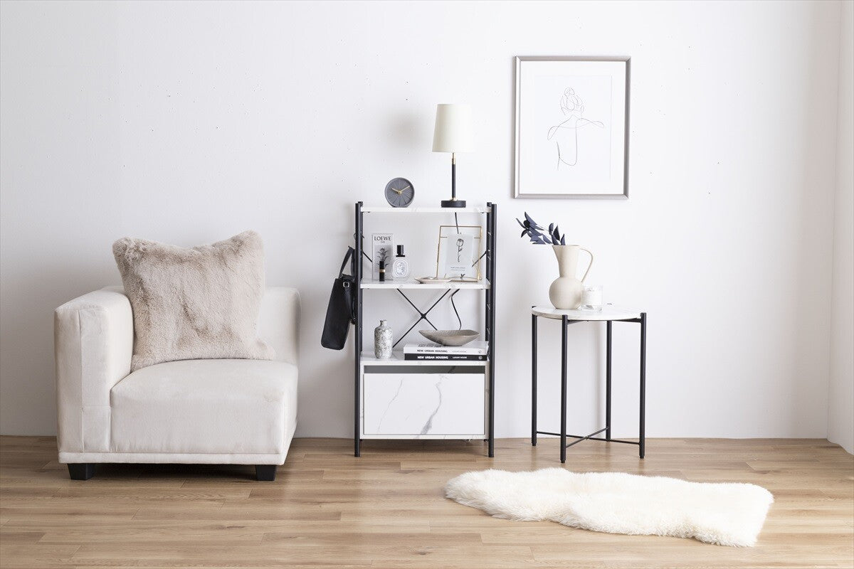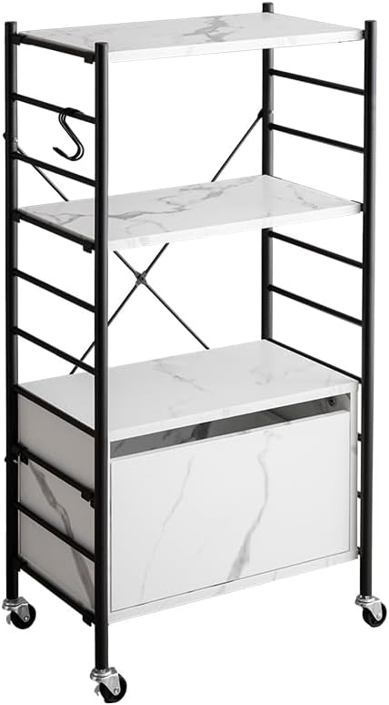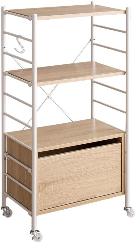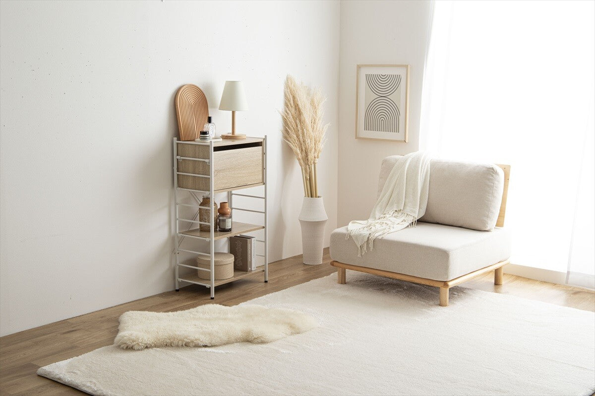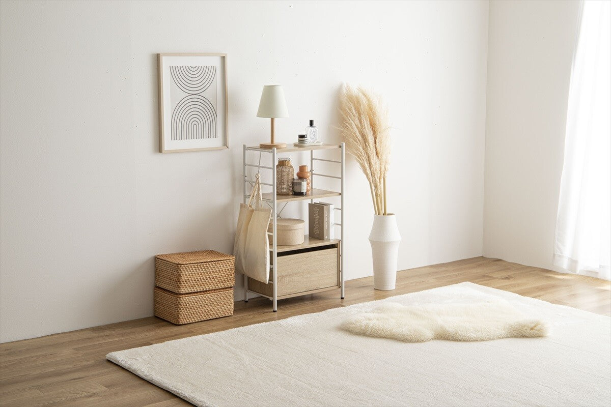 北欧引き出し付き幅50cmシェルフは、シンプルで機能的なデザインが特徴の北欧スタイルのシェルフです。幅50cmのコンパクトサイズで、限られたスペースでも活用可能。引き出し付きで小物や雑貨の収納に便利。調整可能な棚は8cm間隔で高さを変えられ、各棚の耐荷重は約10kg。木目調の棚板とスタイリッシュなフレームが北欧風インテリアにぴったり。キャスター付きで移動も簡単。リビング、キッチン、オフィスなど多用途で活用できます。