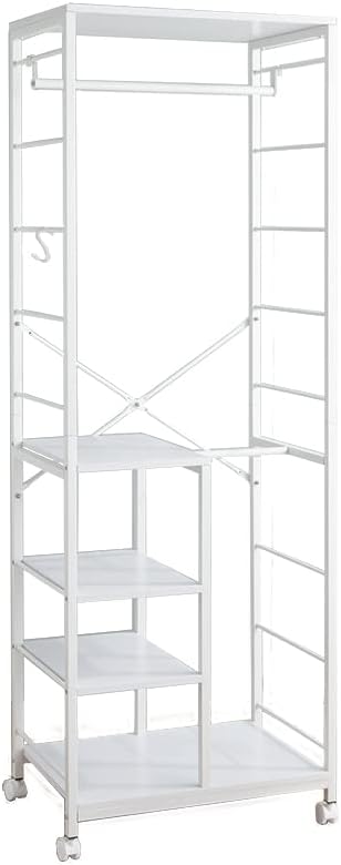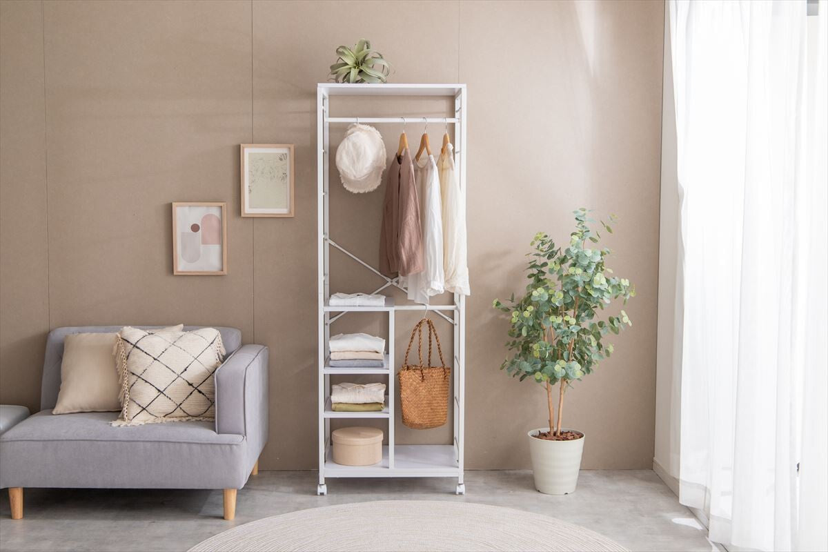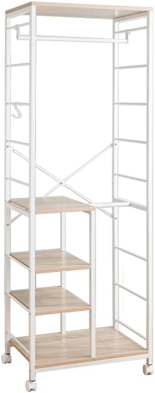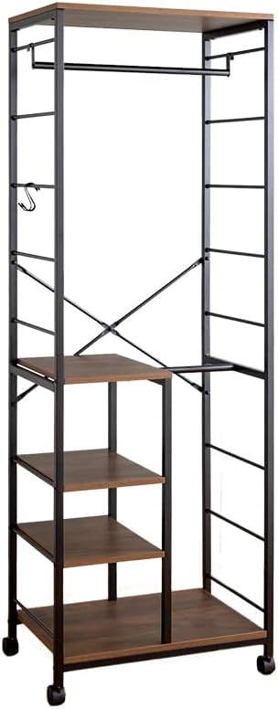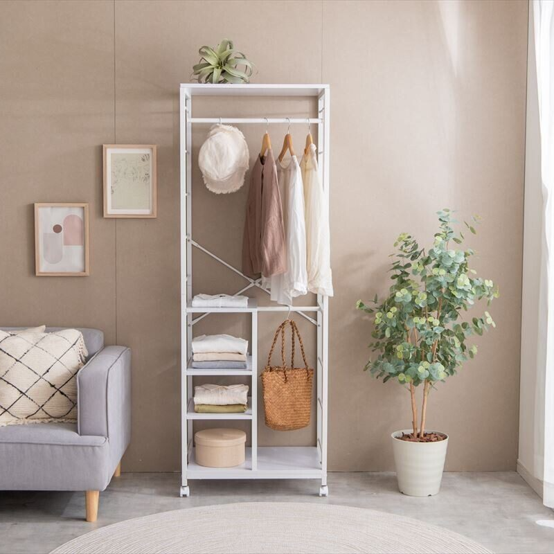 シンプルモダン木製天板スチールフレーム棚付きハンガーラック