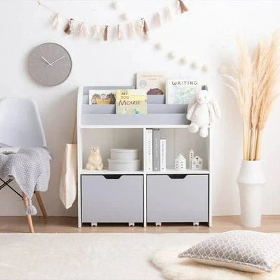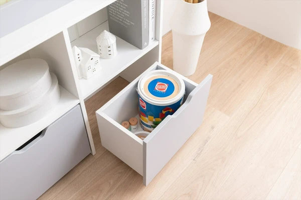 北欧木製引き出し収納タイプ絵本棚は、シンプルで洗練されたデザインが特徴です。高品質な木材を使用し、耐久性が高く、長く使用できます。上部には絵本を立てて収納できるスペースがあり、下部には2つの引き出しが付いています。おもちゃや小物の整理に便利で、リビングや子供部屋に自然に溶け込みます。引き出しにはキャスターが付いており、移動が簡単。角が丸く加工されており、小さなお子様がいる家庭でも安心して使用できます。幅84cm、奥行き29.5cm、高さ90cmとコンパクトでありながら、十分な収納力を持っています。北欧風の温かみを演出する木目の美しさが魅力です。