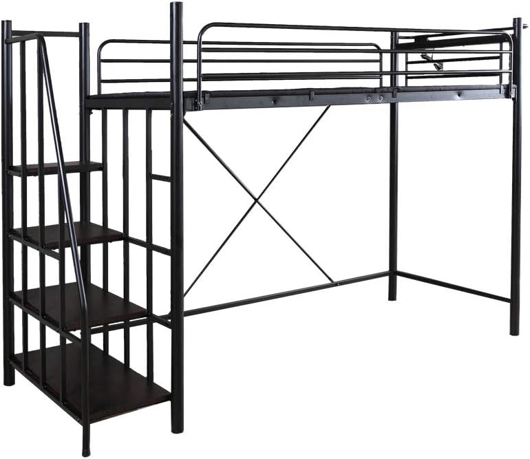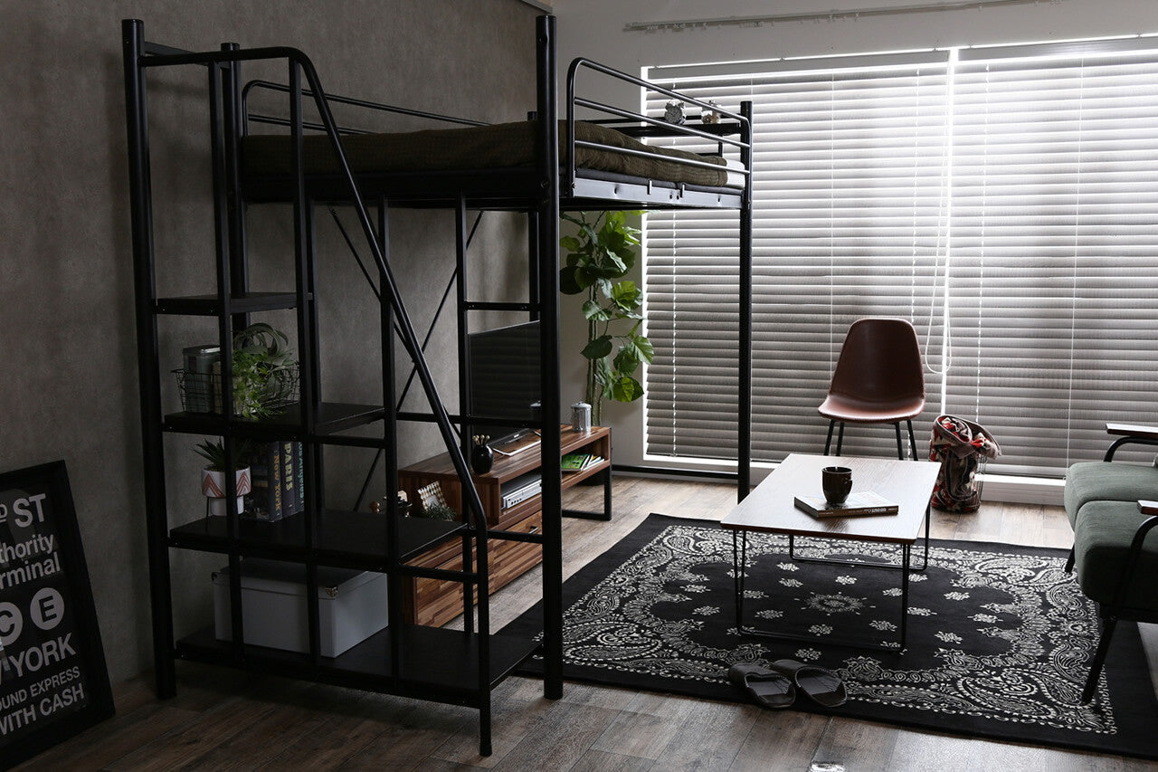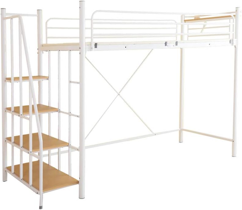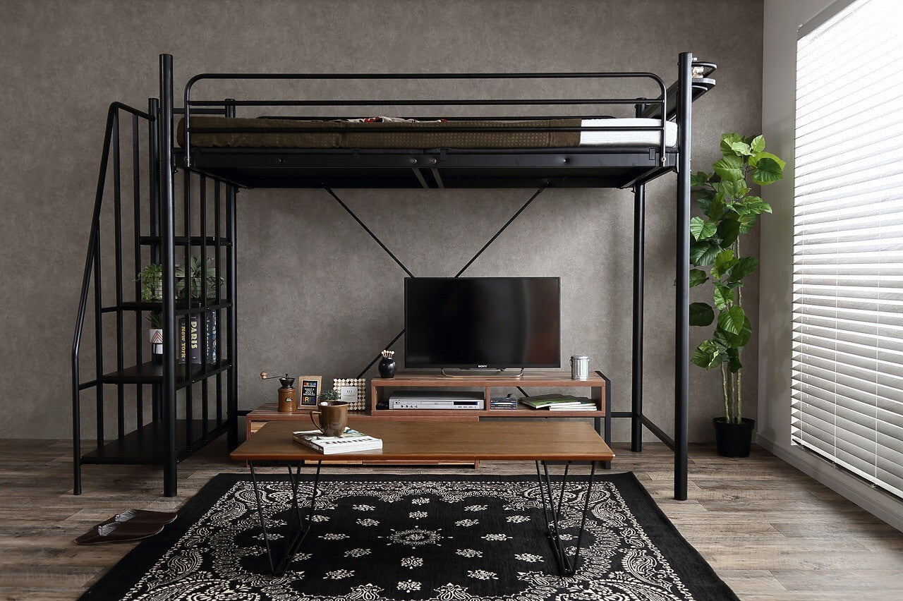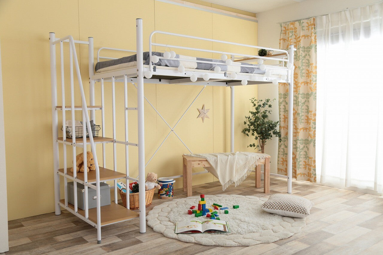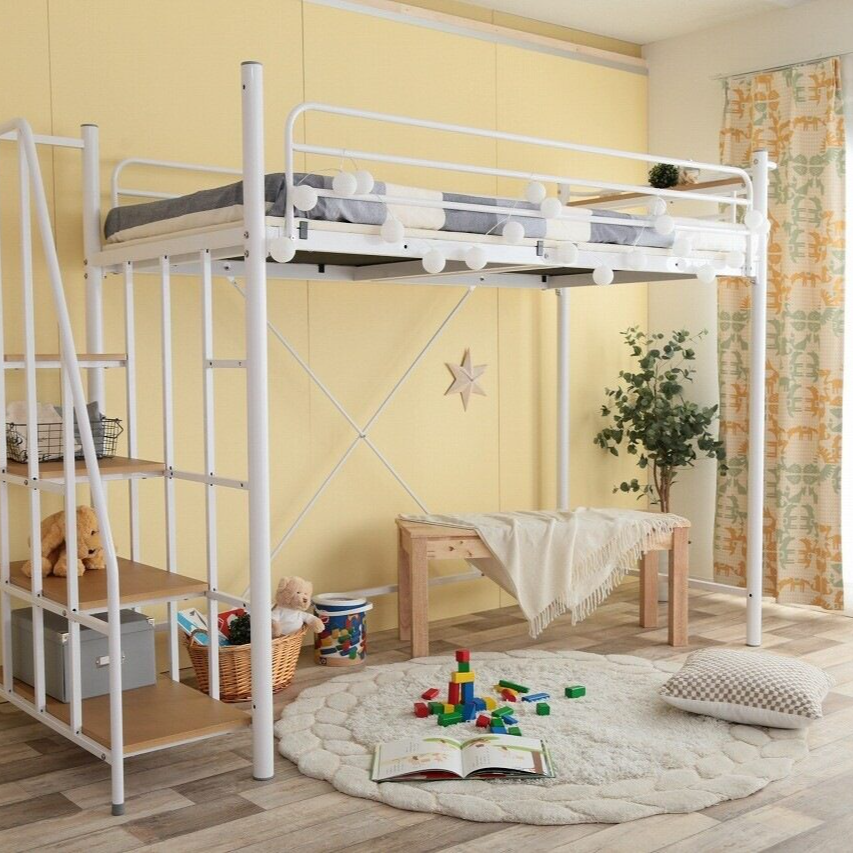 モダンスチールフレーム宮棚・2口コンセント・階段付きロフトシングルベッド
