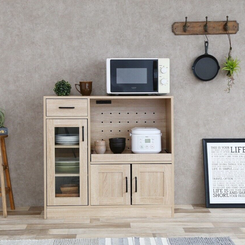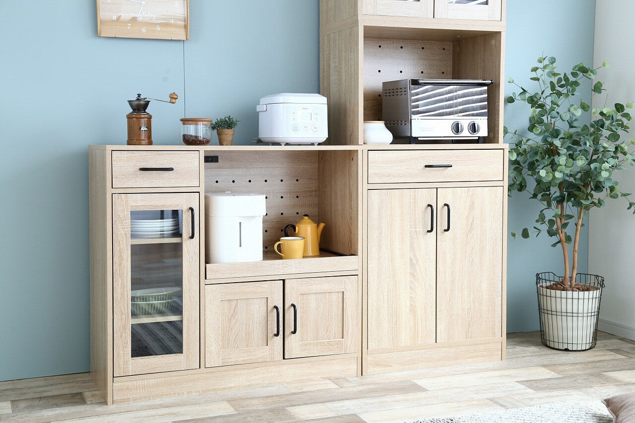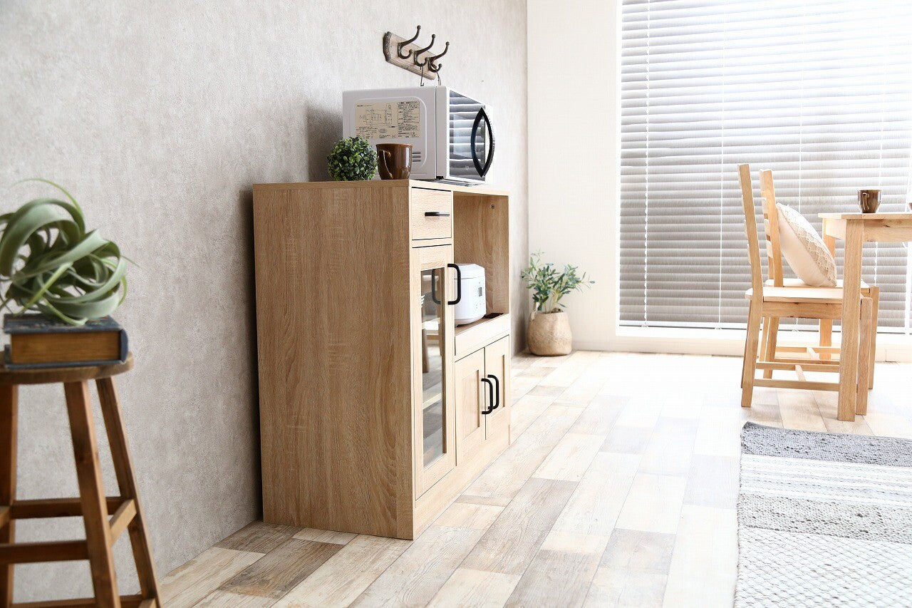シンプルナチュラル木製3枚扉レンジ台は、ナチュラルな木目調とシンプルなデザインが特徴で、どんなインテリアにもマッチします。電子レンジや炊飯器などのキッチン家電を一か所にまとめて収納でき、コンパクトなサイズで限られたスペースにも設置しやすいです。引き出しとガラス扉のキャビネットがあり、収納力に優れ、カトラリーや食器を美しくディスプレイ可能。可動棚で収納物に応じて高さを調節でき、組み立ても簡単。高品質な素材を使用しながらもリーズナブルな価格設定で、機能性とデザイン性を兼ね備えたキッチンの整理整頓に最適な一品です。