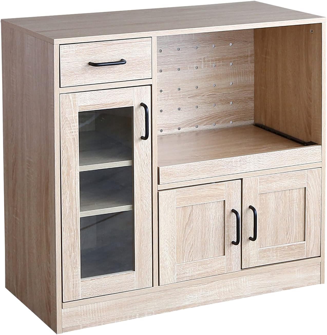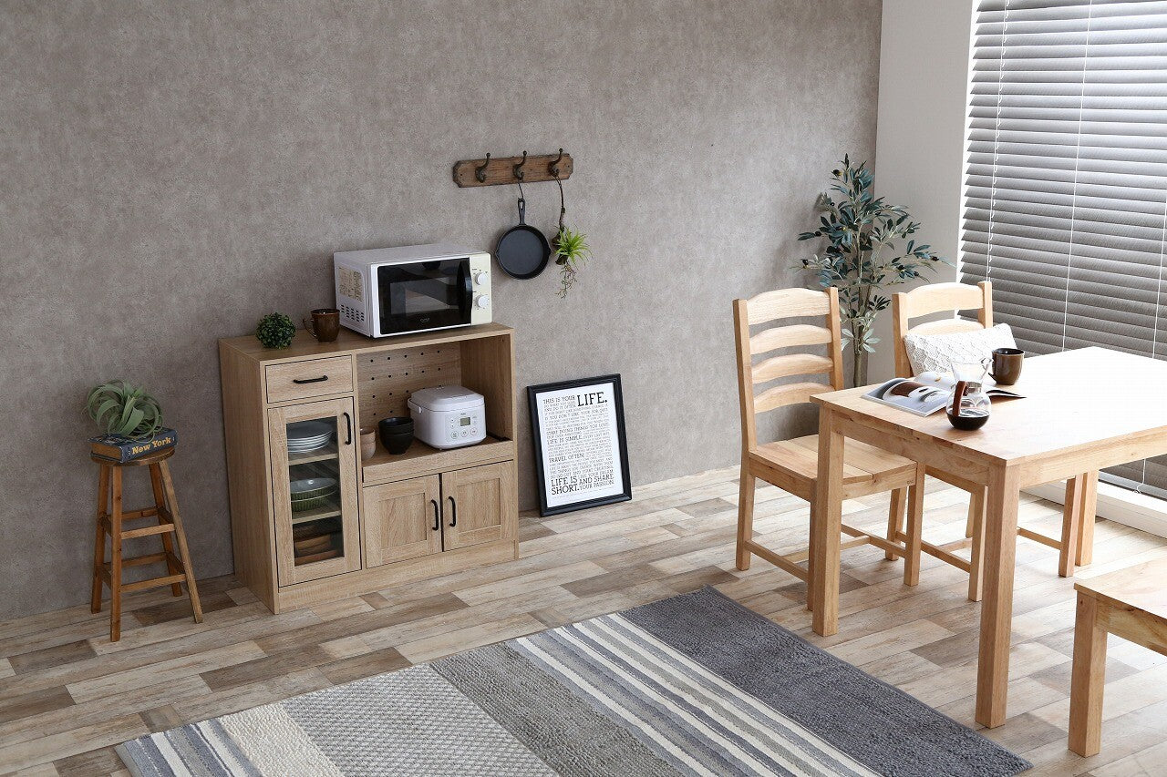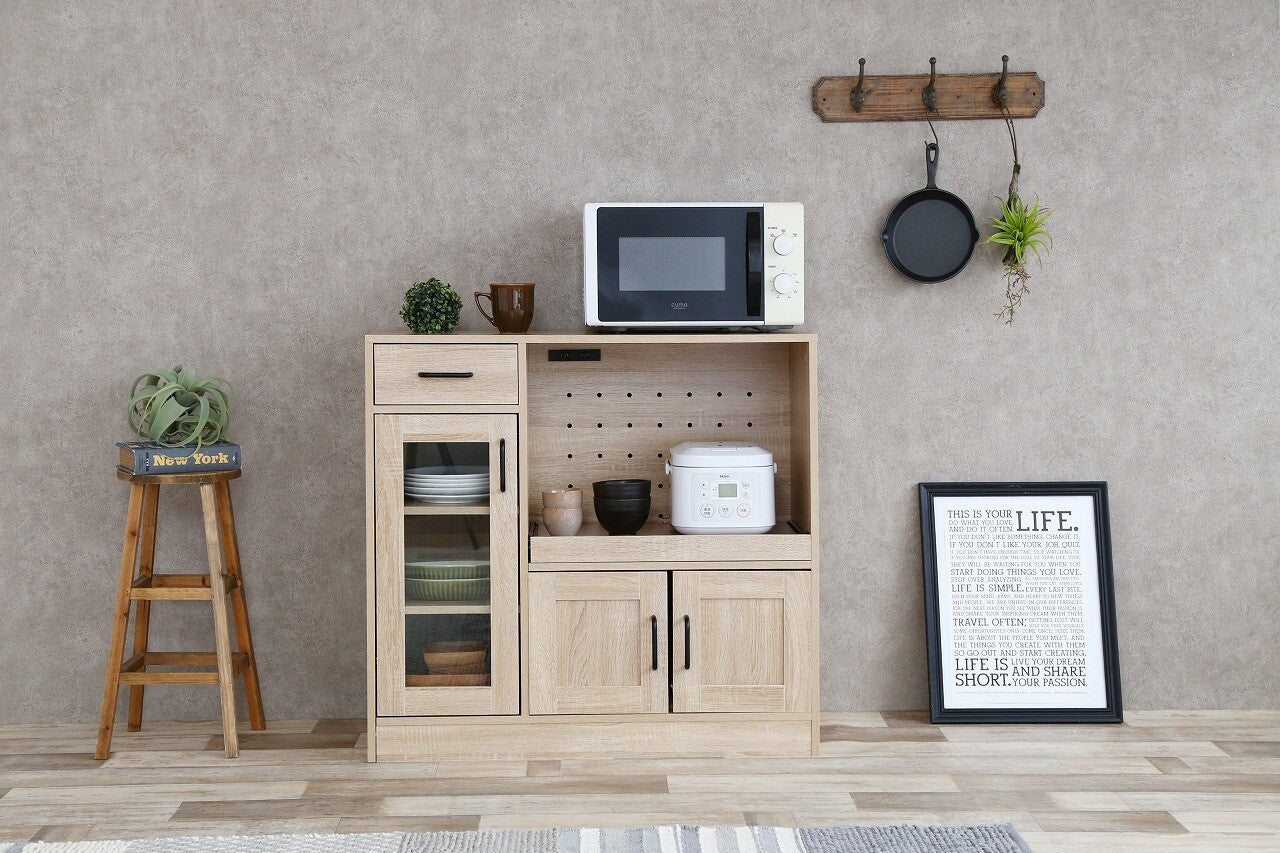 シンプルナチュラル木製3枚扉レンジ台は、ナチュラルな木目調とシンプルなデザインが特徴で、どんなインテリアにもマッチします。電子レンジや炊飯器などのキッチン家電を一か所にまとめて収納でき、コンパクトなサイズで限られたスペースにも設置しやすいです。引き出しとガラス扉のキャビネットがあり、収納力に優れ、カトラリーや食器を美しくディスプレイ可能。可動棚で収納物に応じて高さを調節でき、組み立ても簡単。高品質な素材を使用しながらもリーズナブルな価格設定で、機能性とデザイン性を兼ね備えたキッチンの整理整頓に最適な一品です。