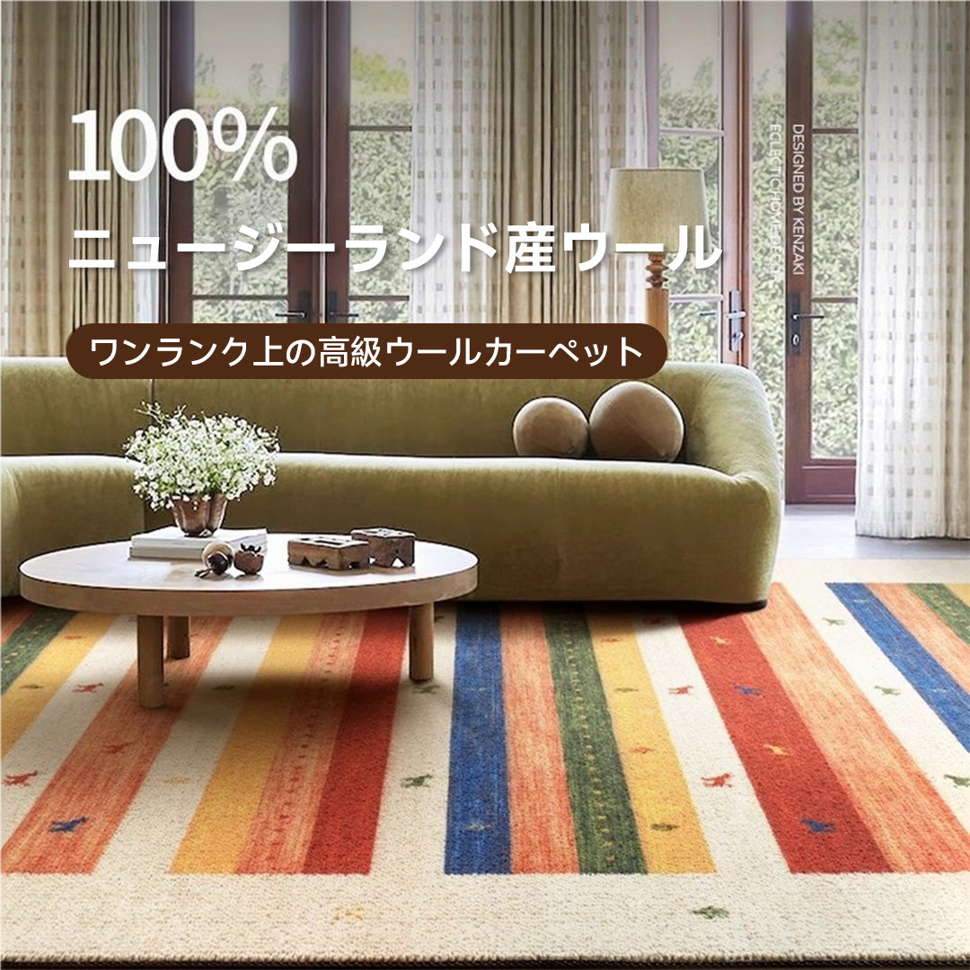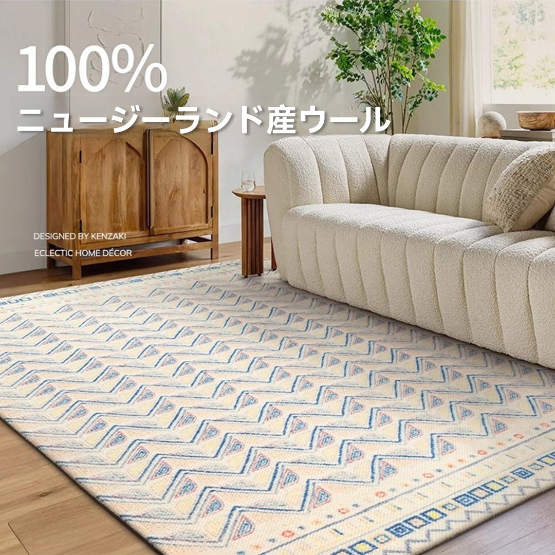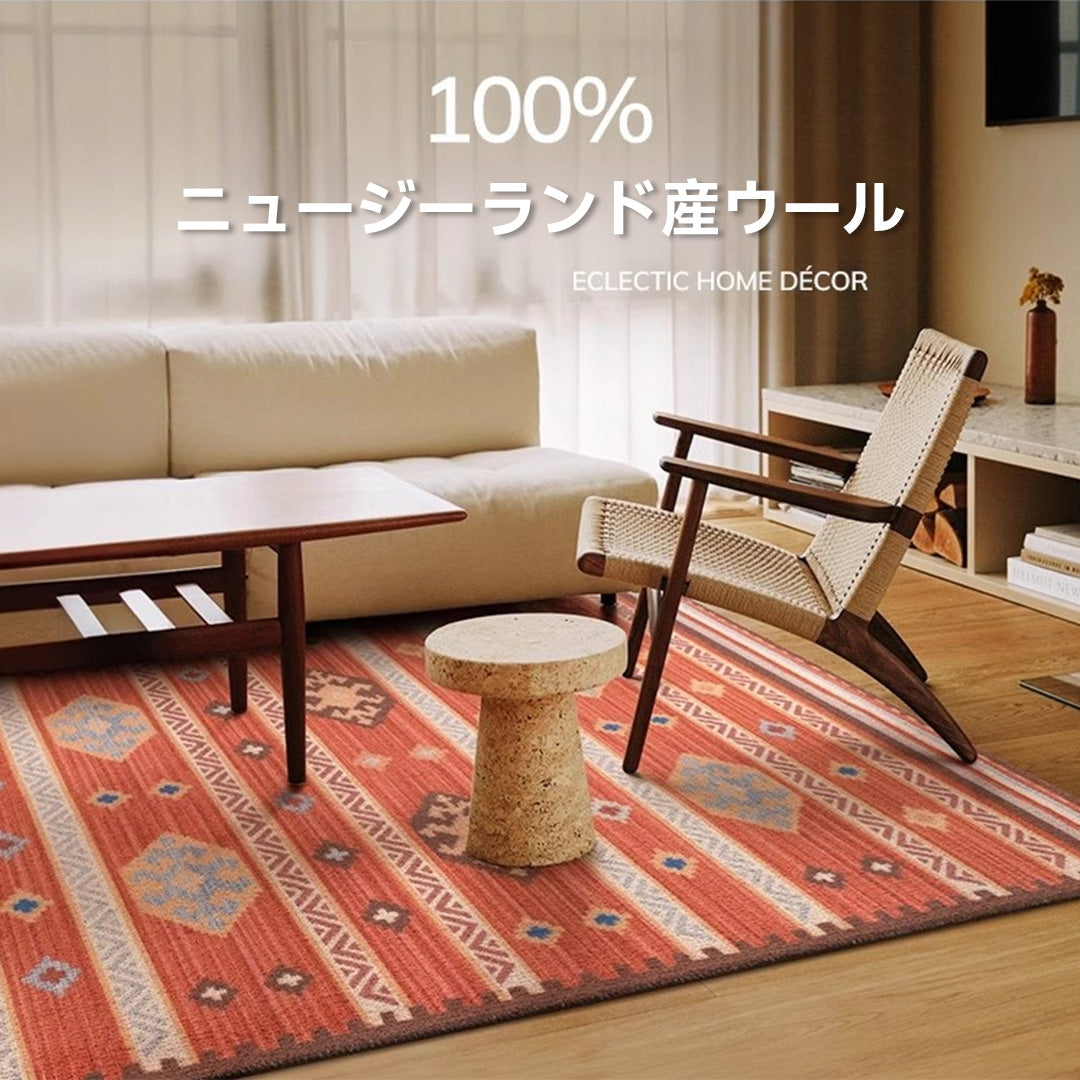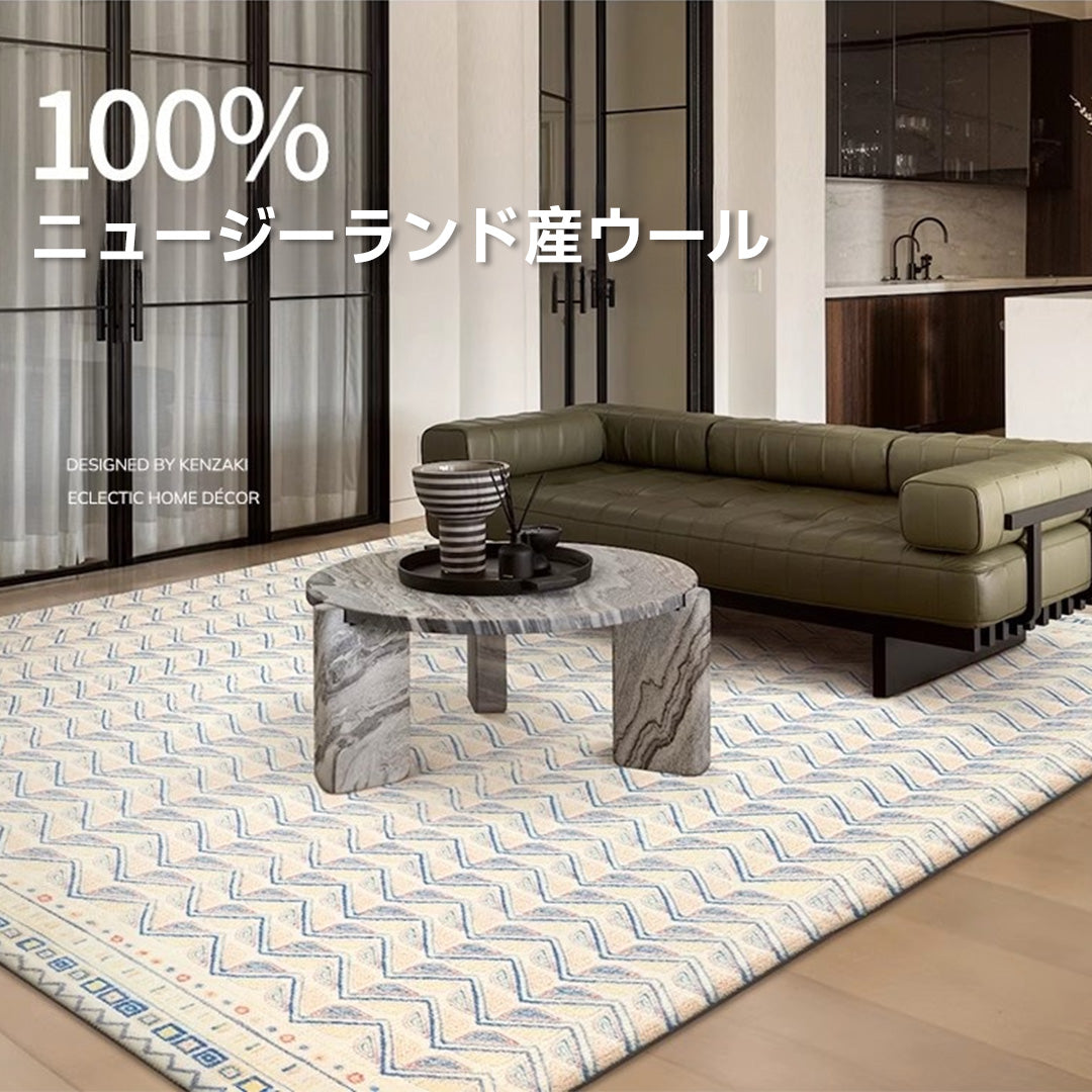 Sahara 高級ニュージーランド産ウールラグは、100%純正ニュージーランドウールを使用し、優れた耐久性と自然な防汚効果を持つ高品質なラグです。柔らかく滑らかな肌触りが特徴で、リビングや寝室、書斎など多様なシーンで使用可能です。カラフルなストライプやユニークなパターンが施され、どんなインテリアにもマッチします。約11mmの厚みがあり、ふっくらとしたボリューム感を提供し、手入れも簡単です。環境に優しく健康的な生活空間を提供するこのラグは、快適な生活空間を彩る理想的なアイテムです。
