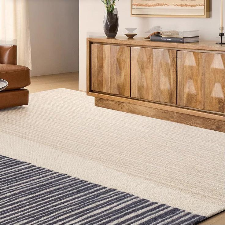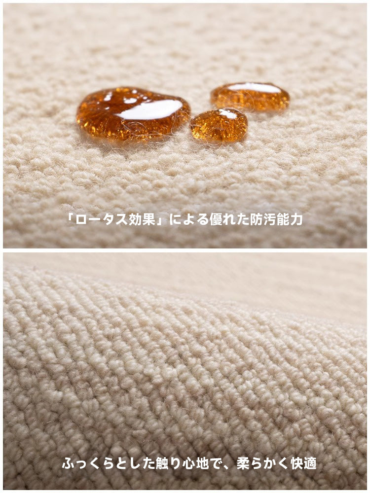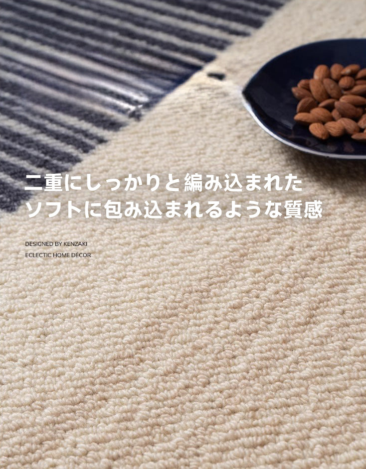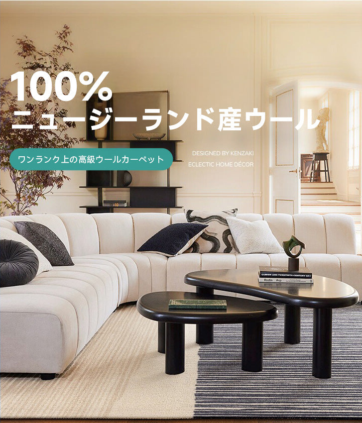 Eternal 高級ニュージーランド産ウールラグは、100%ニュージーランド産の高級ウールを使用したラグです。柔らかな肌触りと快適な使用感を提供し、優れた防汚性と耐火性を兼ね備えています。シンプルでモダンなデザインはどんなインテリアにも調和し、ストライプのデザインが洗練された印象を与えます。厚さ約11.5mmで足裏に優しい弾力を持ち、吸音・防音効果もあります。環境に優しいコットン素材の裏地を使用し、ニュージーランドの工場で厳しい品質管理が行われています。お手入れが簡単で、リビングや寝室に高級感と快適さをもたらします。
