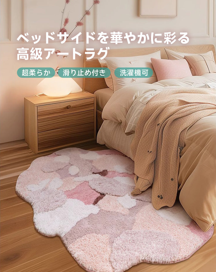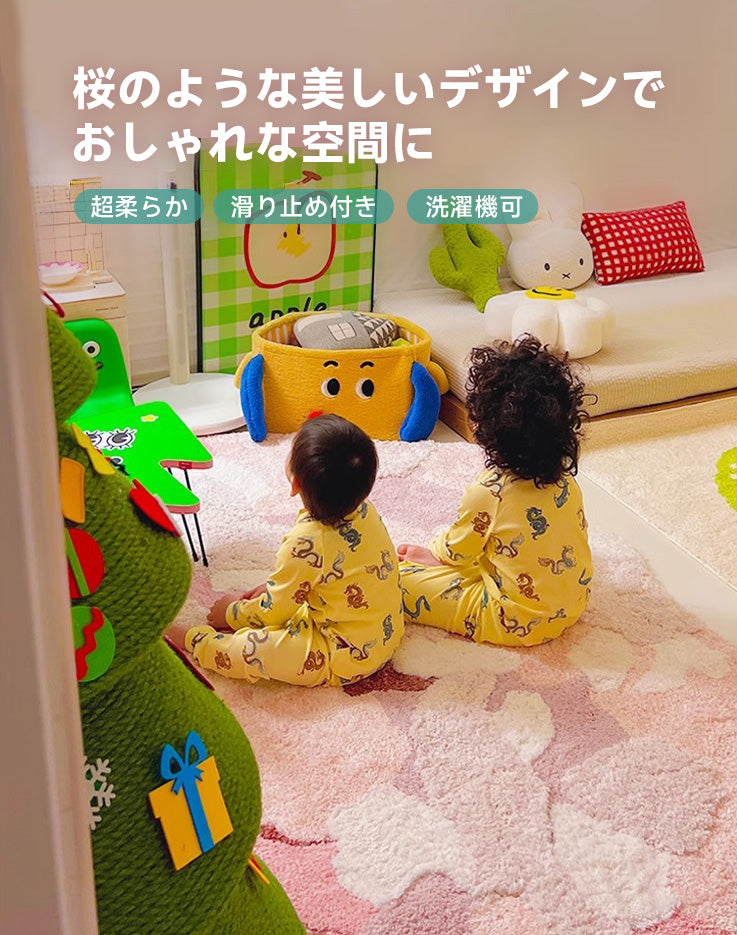 Sakura ふわふわ柔らかラグは、桜の花びらをモチーフにした優雅で幻想的なデザインが特徴のラグです。超柔らかで肌に優しい触感を持ち、滑り止め付きで安全性も高く、洗濯機での洗浄が可能なためお手入れも簡単です。多様なサイズバリエーションがあり、リビングやベッドサイド、子供部屋など様々なシーンで活躍します。耐久性にも優れており、長期間の使用が可能です。どんなインテリアにもマッチし、空間を一層魅力的に演出します。