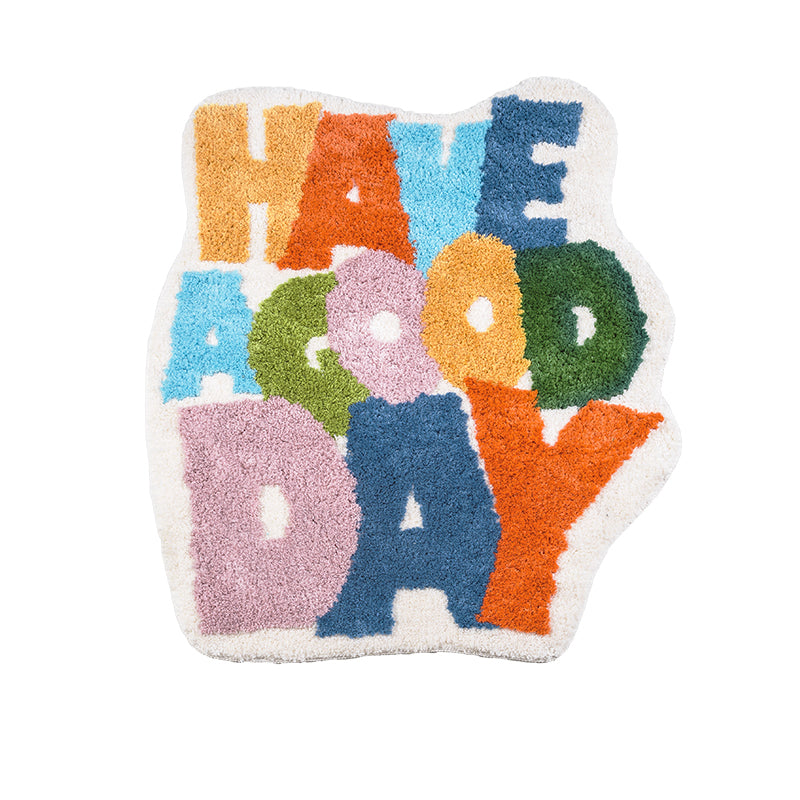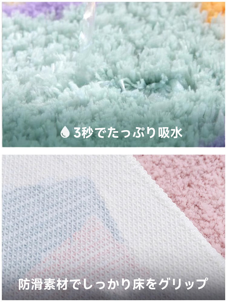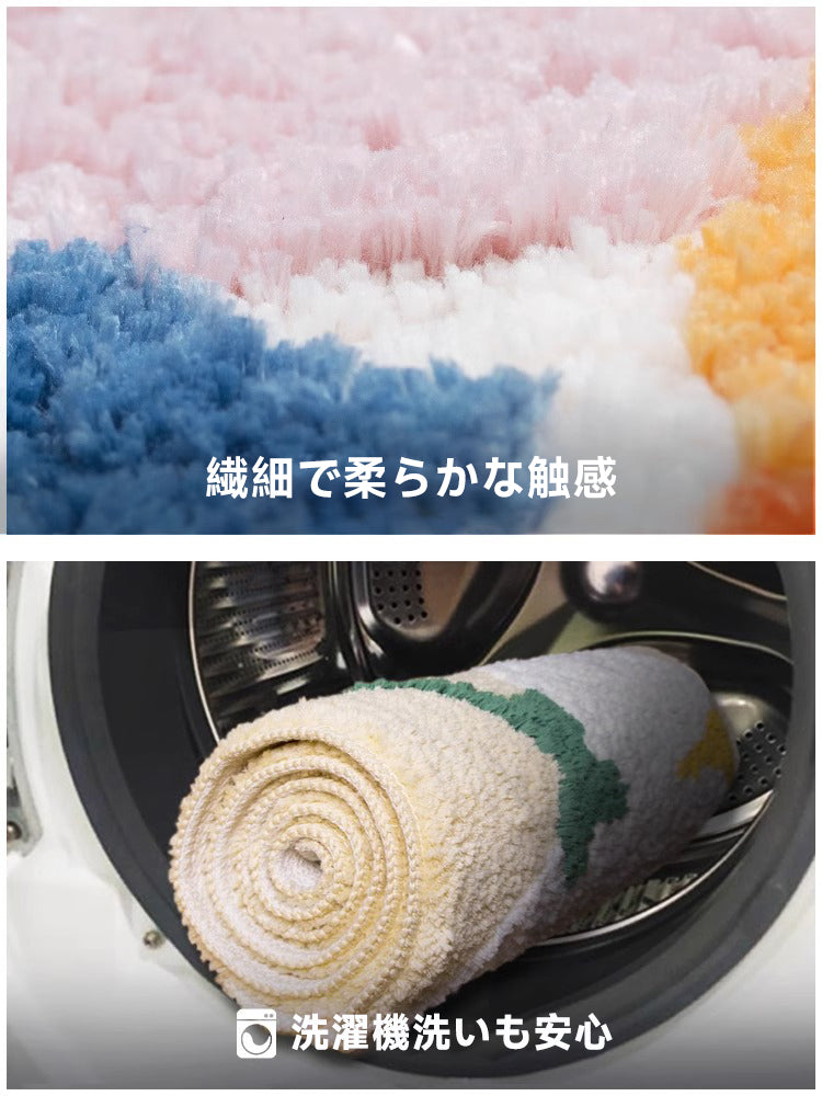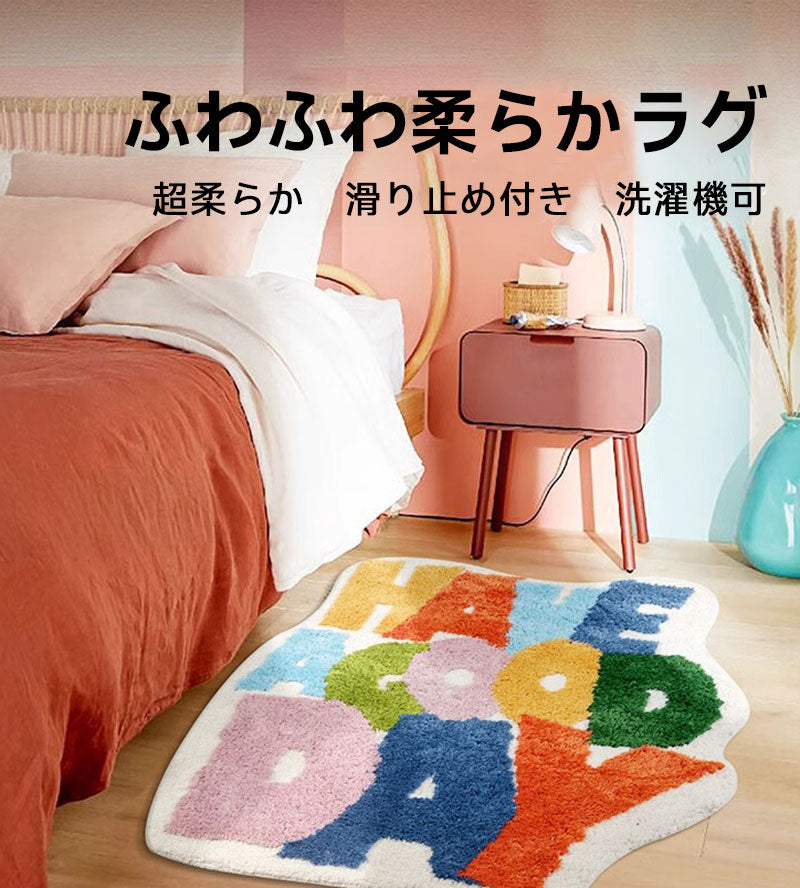 Good Dayふわふわ柔らかラグは、毎日に明るさと快適さをプラスするデザインが特徴です。「HAVE A GOOD DAY」のカラフルな文字が部屋をポップで明るい雰囲気にし、100×90cmのサイズで様々なスペースにフィットします。表面は100%ポリエステル繊維で柔らかく、約21mmの厚さでふわふわした感触を提供。TPE熱可塑性防滑底で滑り止め効果が高く安全。優れた吸水性で3秒でたっぷり吸水し、洗濯機で洗えるのでお手入れも簡単。OEKO-TEX認証を取得し、環境にも優しく、赤ちゃんの肌にも優しい素材を使用しています。