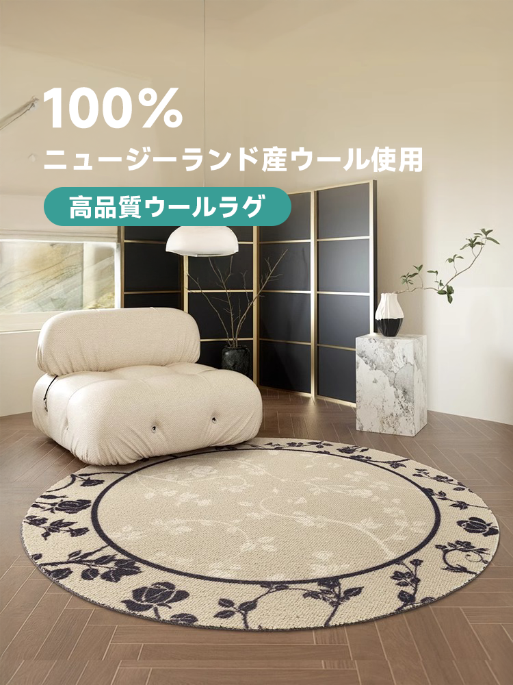 Rose 高級ニュージーランド産ウールラグは、100%ニュージーランド産の高品質ウールを使用し、贅沢な質感と優れた耐久性を兼ね備えたラグです。ニュージーランドの羊毛公社の認証を受けたロムニー種のウールを使用しており、環境にも優しい製品です。美しいバラ模様が施され、どんなインテリアにもマッチし、ラウンドとスクエアの2種類の形状があり、さまざまなスペースに適応します。ロータス撥水効果により防汚性能が高く、厚さ約1.1cmでふっくらとした踏み心地を提供します。環境に配慮した製品で、日常の快適さとエレガントなデザインを兼ね備えた一品です。