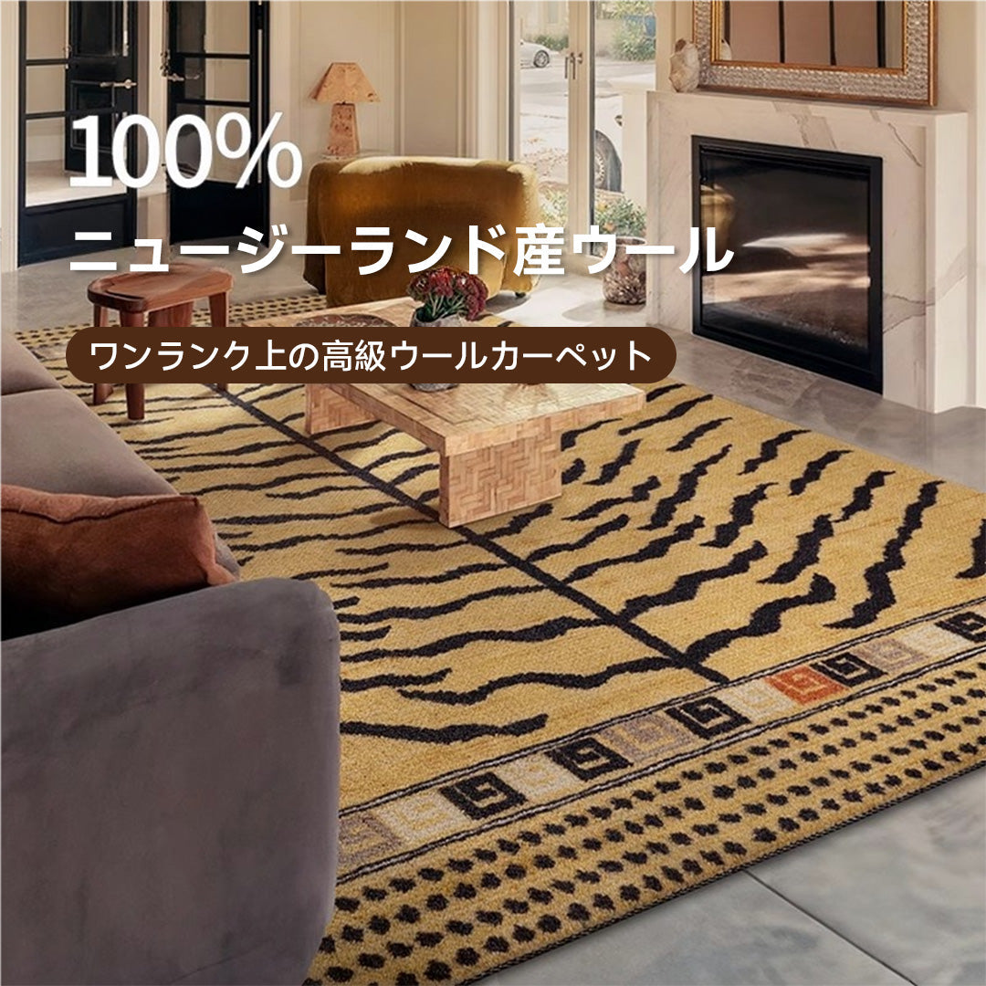 Tiger Yellow 高級ニュージーランド産ウールラグは、100%ニュージーランド産ウールを使用し、滑らかな肌触りと精緻なディテールが特徴です。タイガー柄デザインがインテリアにアクセントを加え、リビングや玄関、寝室など多用途に対応。耐久性と柔らかさを兼ね備え、自然な防汚効果で手入れも簡単。厚さ約11mmのパイルが足元に心地よい感触を提供し、吸音性も優れています。掃除機での定期的な掃除を推奨し、部分的な汚れは軽く拭き取るだけでOKです。ニュージーランドウールの高級感をぜひお試しください。