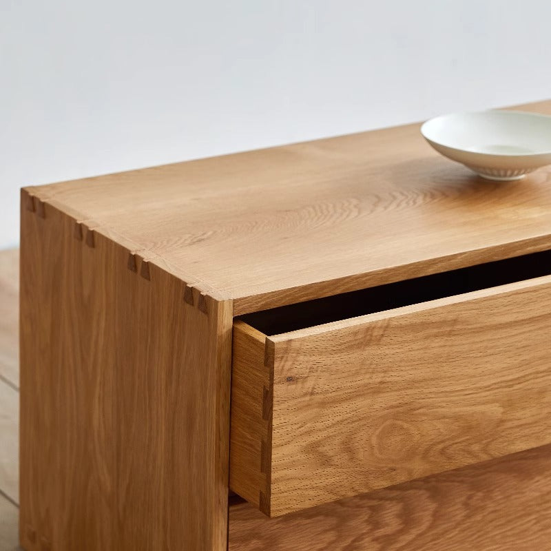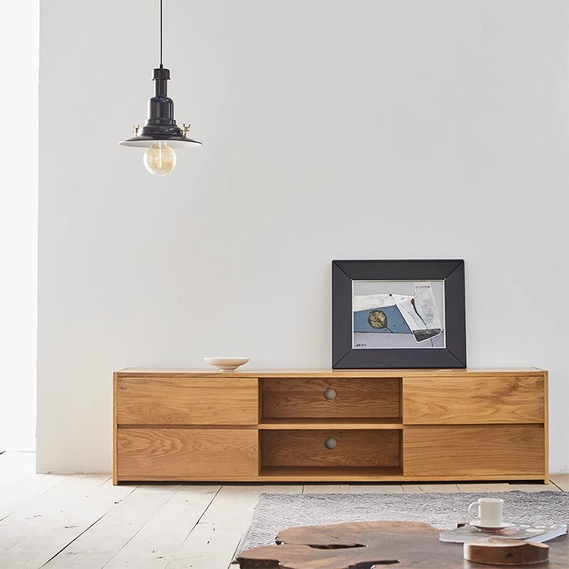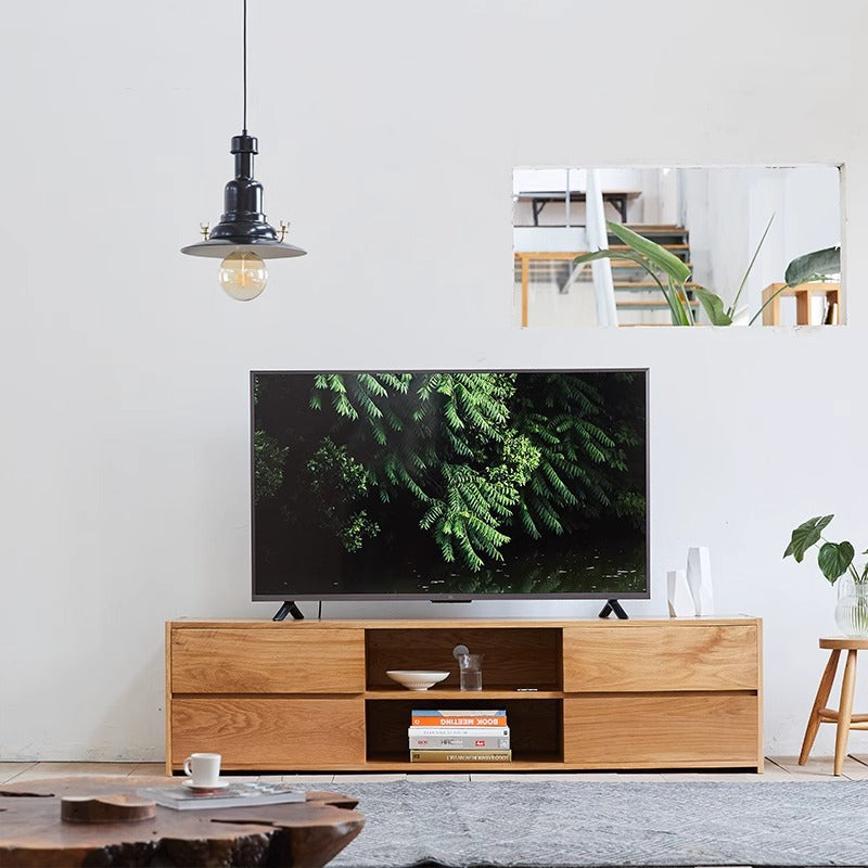ホワイトオーク製テレビキャビネットは、アメリカ産の高品質なホワイトオークを使用し、北欧風のシンプルで洗練されたデザインが特徴です。幅180cm x 奥行45cm x 高さ47cmのサイズで、4つの引き出し収納と2つのオープン収納を備え、DVDプレーヤーや書籍、ルーターなどをすっきりと収納できます。ほぞ組接合による強度と美しさを兼ね備え、ウッドワックスオイルまたはエコ無臭塗料で仕上げられたナチュラルな風合いが魅力です。組み立て不要で、すぐに使用可能なこのキャビネットは、どんなインテリアにも調和し、自然と共に豊かな暮らしを提供します。