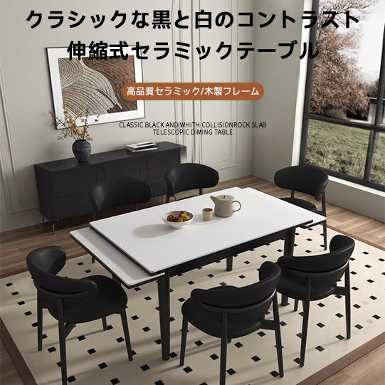 伸縮式セラミックテーブルは、シンプルでクラシックなデザインが特徴です。高品質なセラミックと天然木材を使用し、耐久性と美しさを兼ね備えています。伸縮機能により、6〜8人用の広々としたダイニングスペースを提供します。食品グレードのセラミックで99%の抗菌率を実現し、環境に優しく安全です。モース硬度9級のセラミックは傷や摩耗に強く、1200℃の耐火性能を持ちます。ブラックとホワイトのクラシックなコントラストがどんなインテリアにもマッチします。
