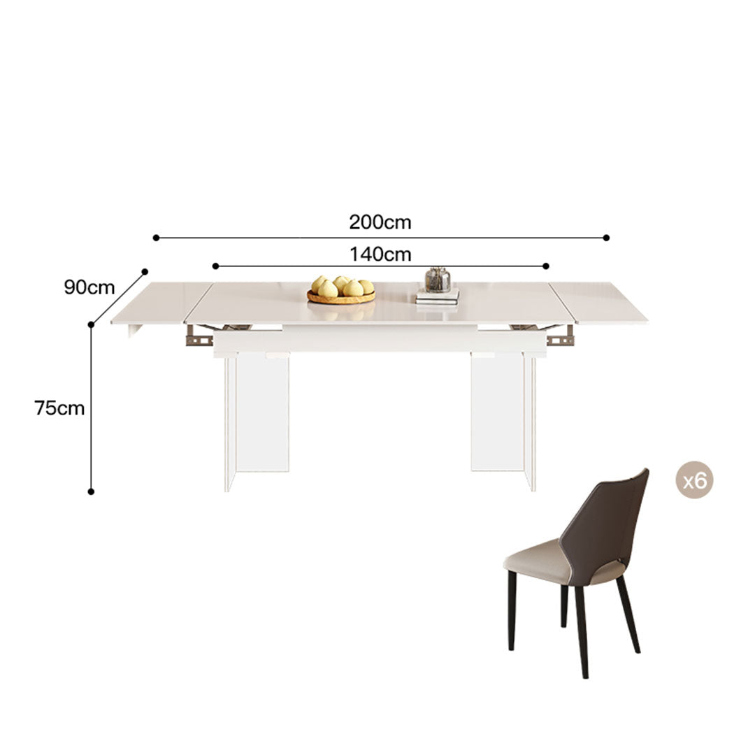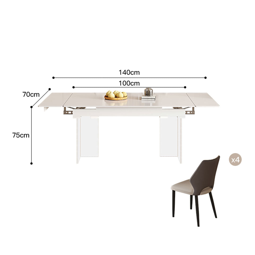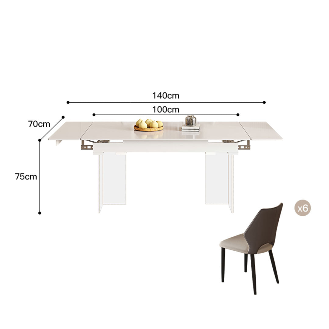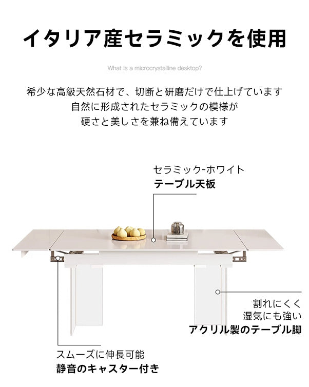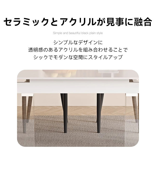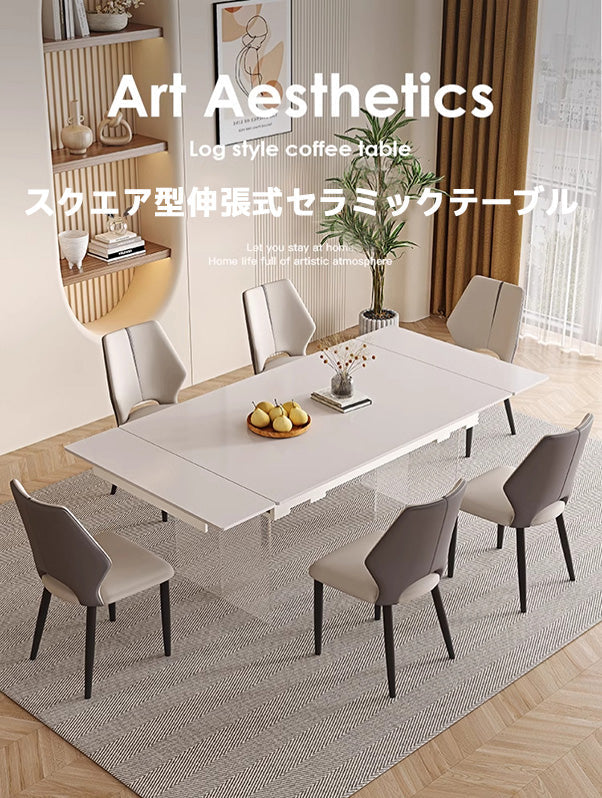 スクエア型伸張式セラミックテーブルセットは、イタリア産の高級セラミックを使用したスタイリッシュで機能的なデザインのテーブルセットです。耐久性と美しさを兼ね備えたこのテーブルは、モース硬度9級の頑丈なセラミックで作られ、耐火性もあり、熱い鍋を直接置いても安心です。透明なアクリル製の脚は軽やかで洗練された印象を与え、部屋全体を明るくします。サイズは100cmから140cmまで3段階に調整可能で、4~8人での使用に最適です。ホームパーティーや家族の集まりにぴったりで、シンプルでモダンな空間を演出します。