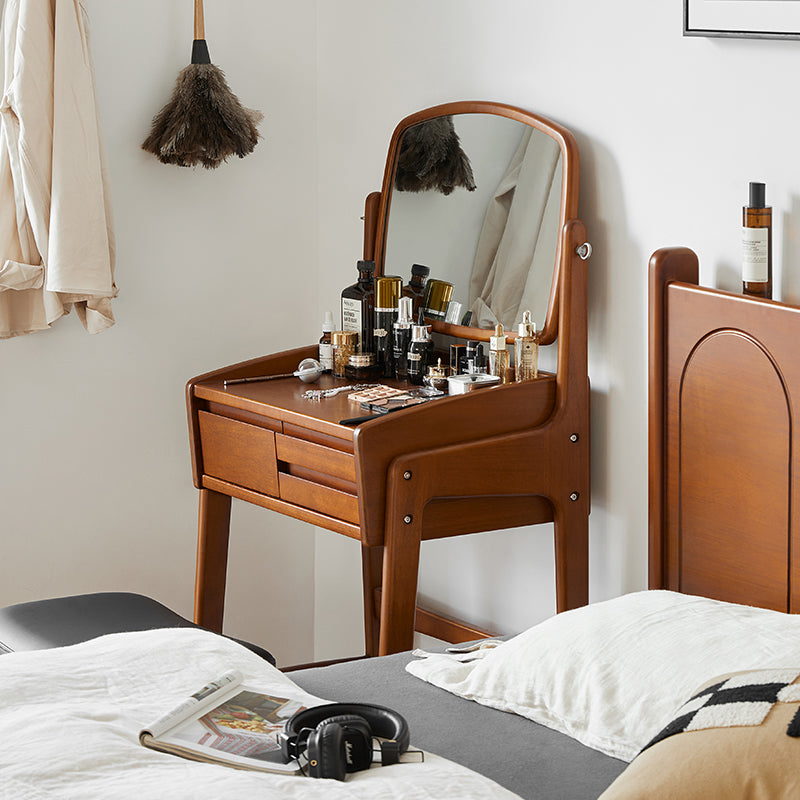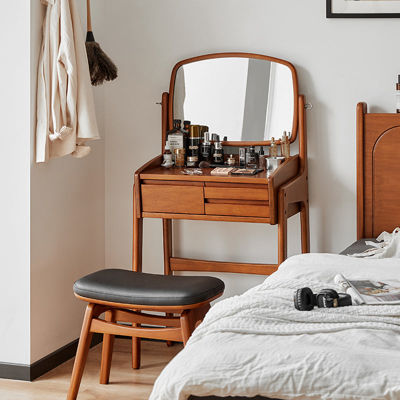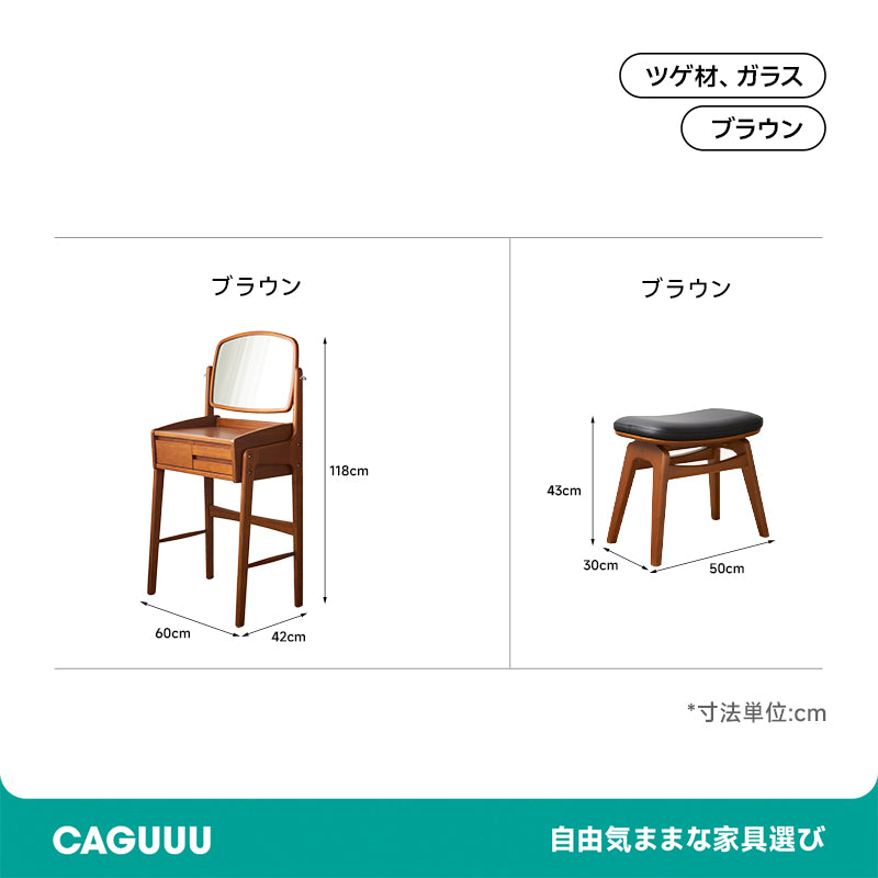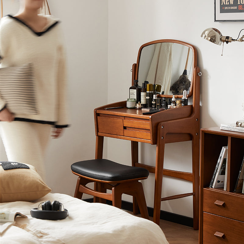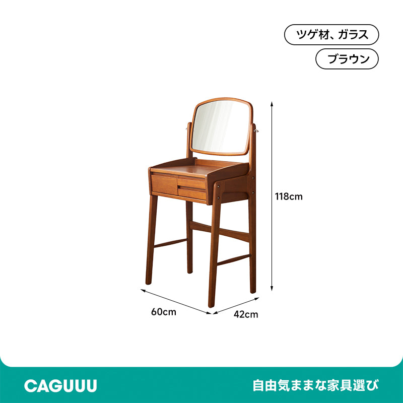 ツゲ材 天然木コンパクトドレッサーは、北米産FAS級の高級ツゲ材を使用した化粧台です。ツゲ材の緻密で美しい木目と温かみのある色合いが、寝室に上質な雰囲気を演出します。コンパクトなデザインで、どんな寝室にもフィットし、3つの引き出しで化粧品や小物をすっきり収納。大型ミラーは角度調整が可能で、使用しないときは隠すこともできます。女性向けに特におすすめのナチュラルで洗練されたデザインです。
