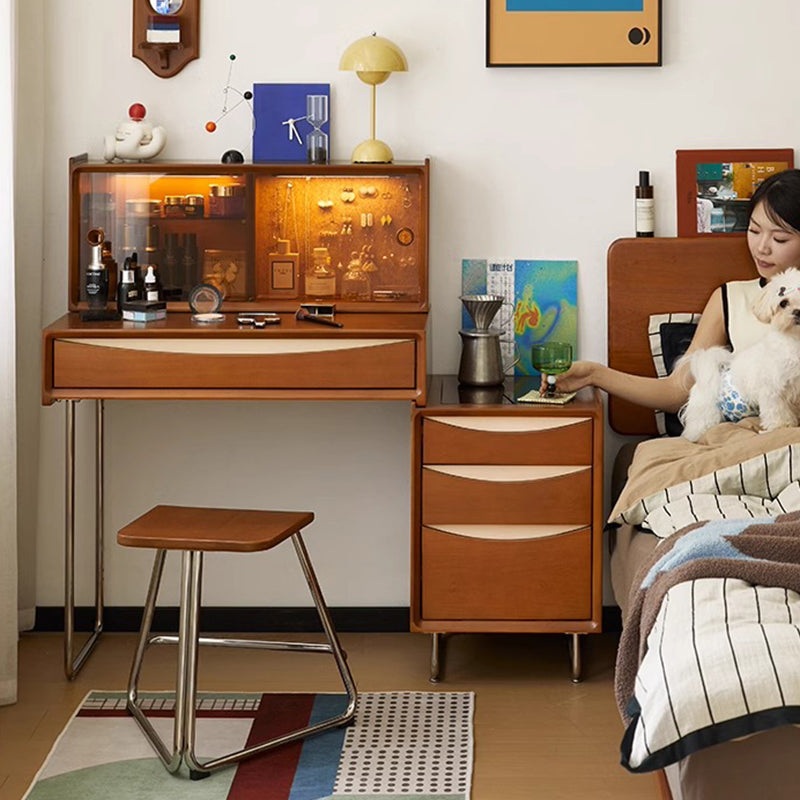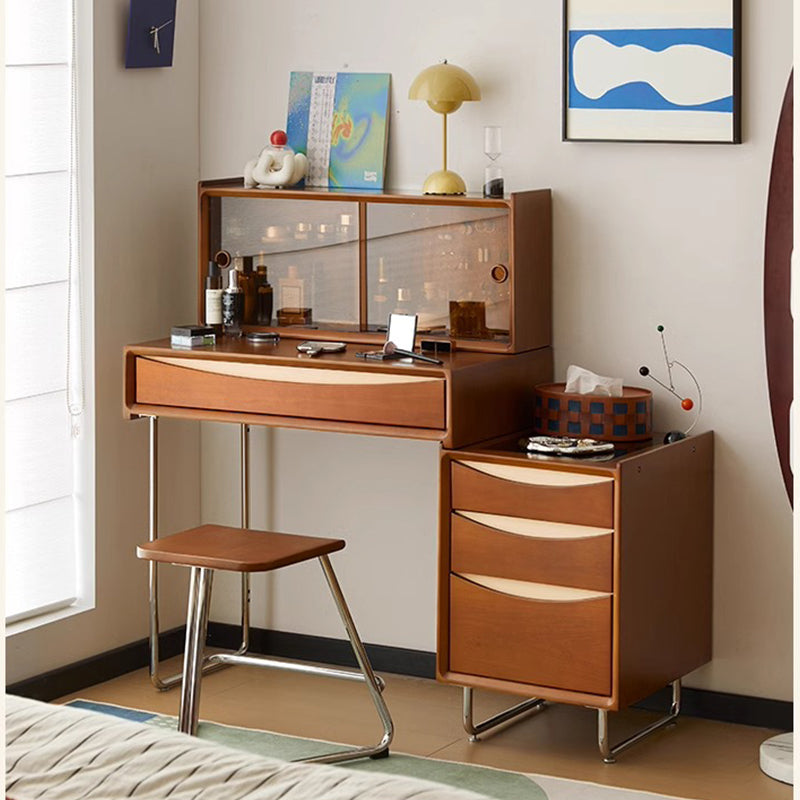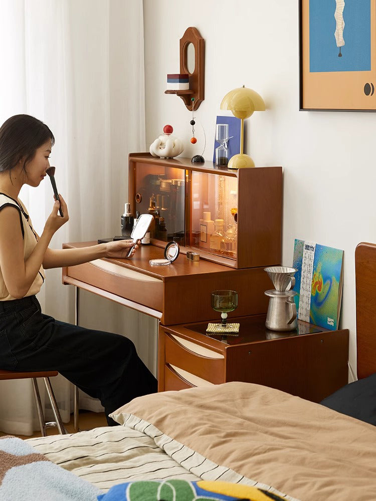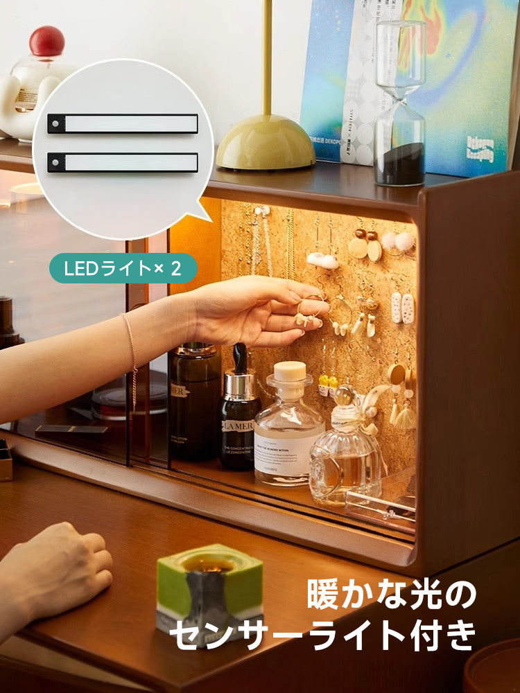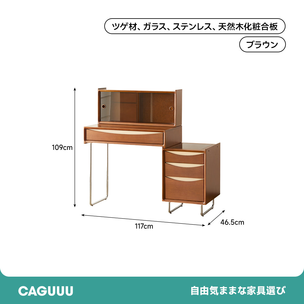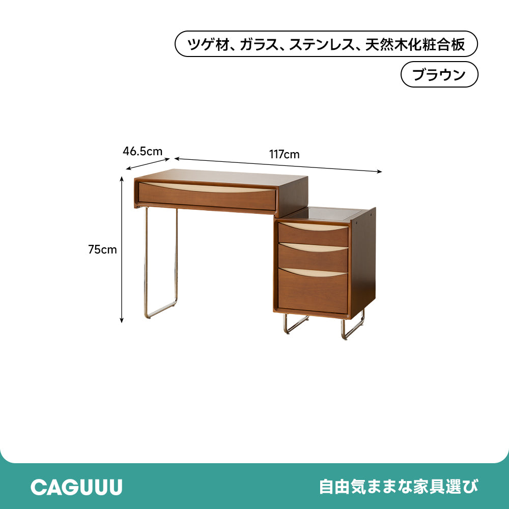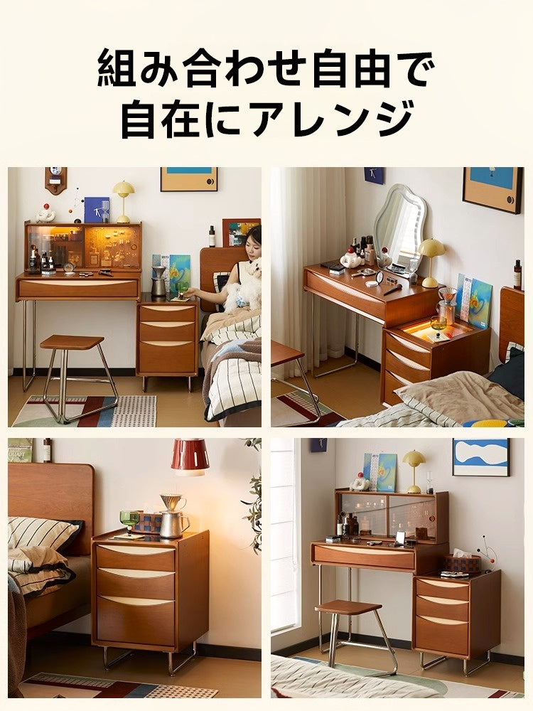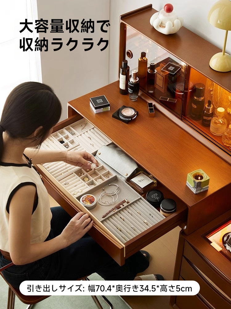 ツゲ材クラシックウッドドレッサーデスクは、最高品質のツゲ材を使用した耐久性と美しさを兼ね備えた製品です。ベッドルームにぴったりのナチュラルでシンプルなデザインが特徴で、ヴィンテージ風の雰囲気を演出します。大容量の引き出しと調整可能なガラス棚を備え、化粧品やアクセサリーを整理整頓できます。ガラスのスライドドアはスムーズに開閉でき、埃から大切な物を守ります。さらに、暖かな光のセンサーライト付きで夜間でも使いやすく、簡単に組み立てられる設計です。多用途な使用が可能で、寝室に洗練された美しさをプラスします。