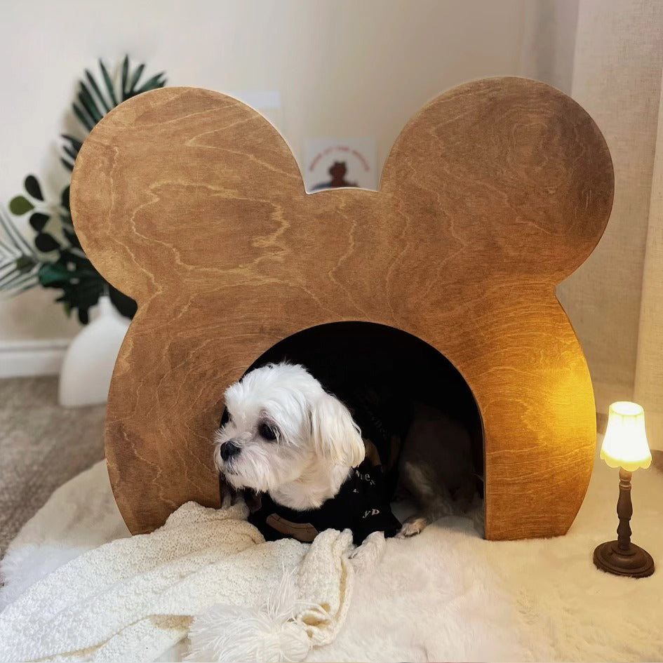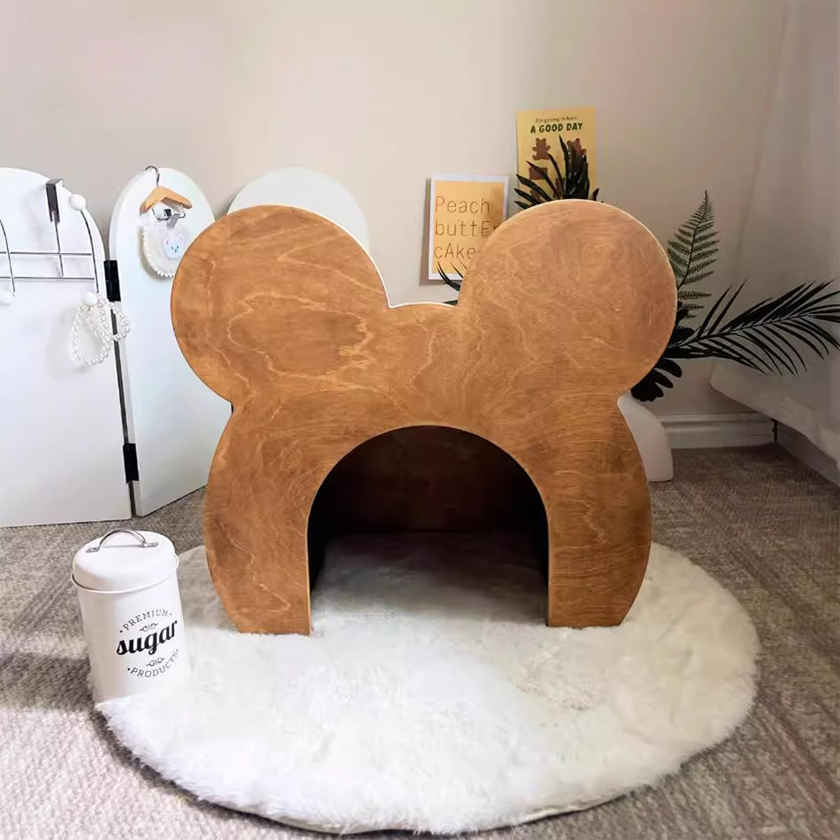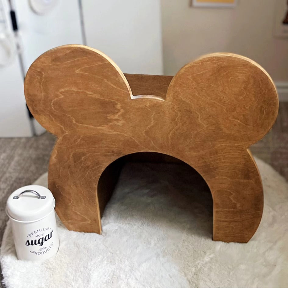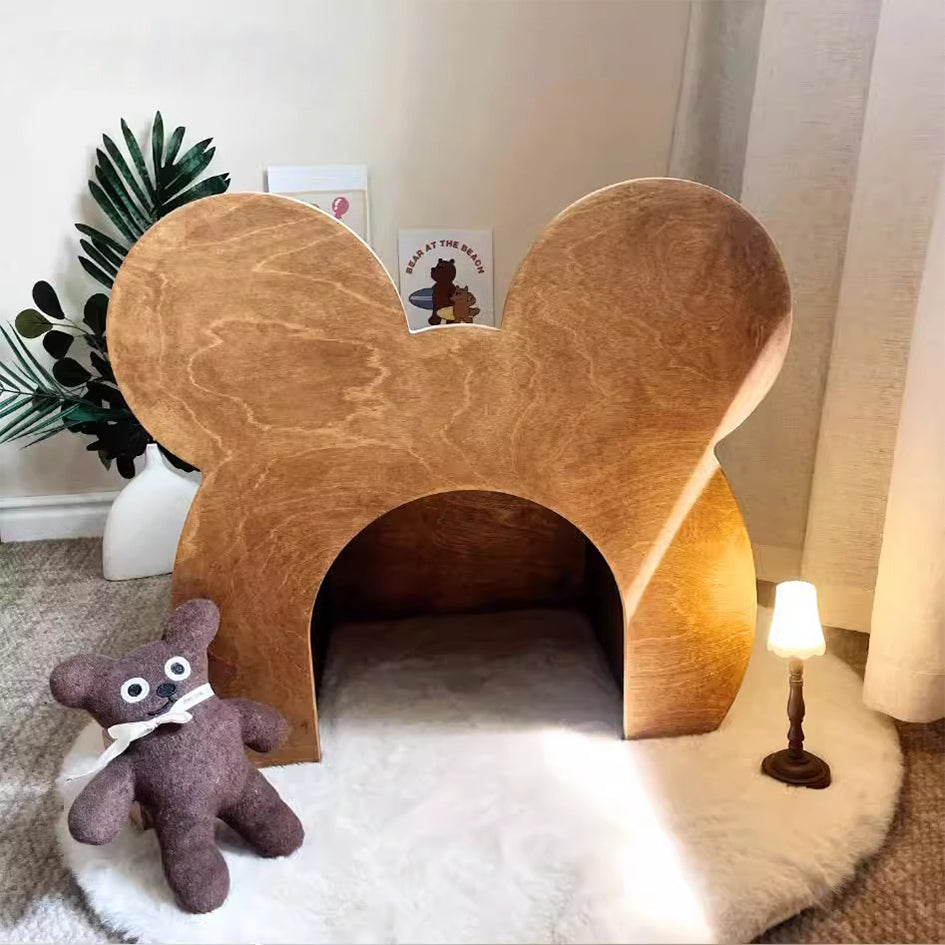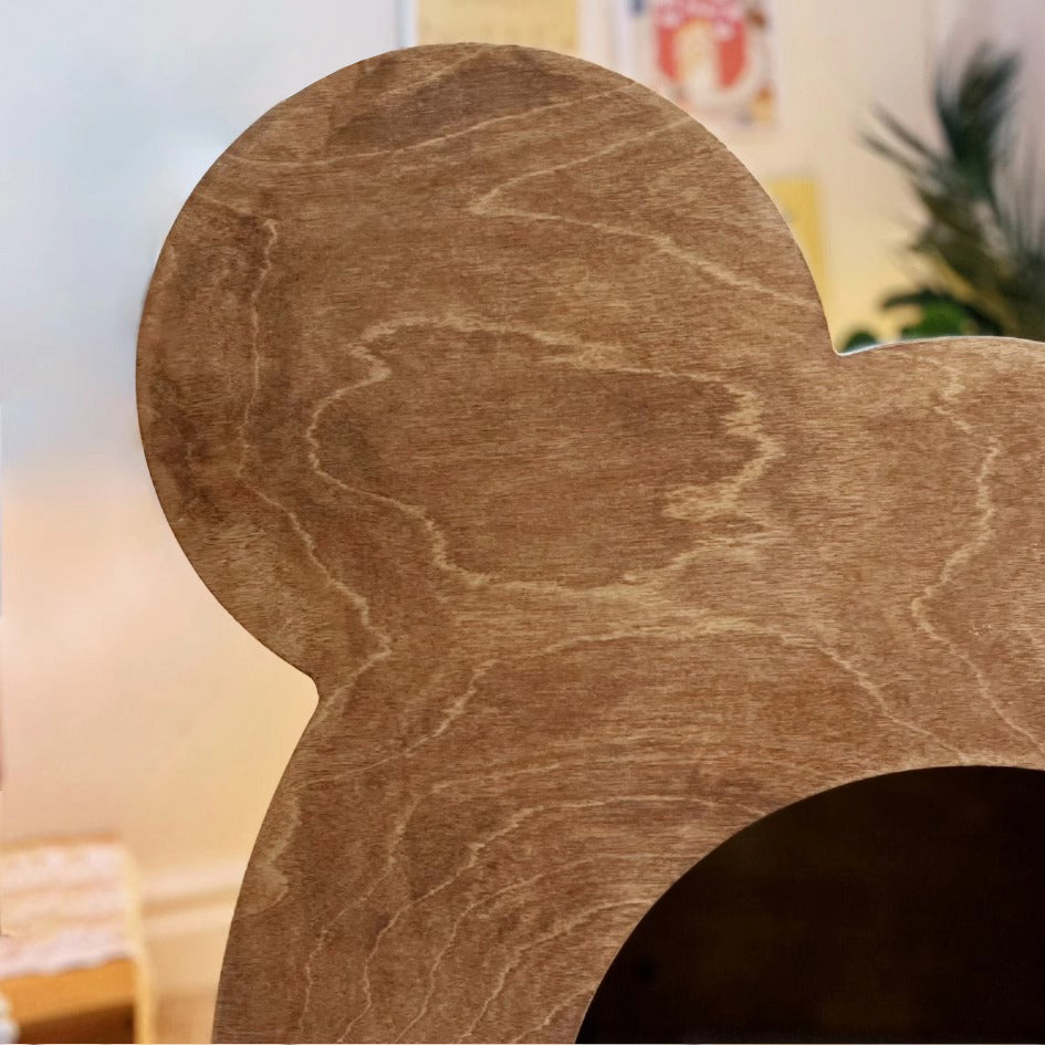 「クマの小部屋」は、ペットに快適で安全なスペースを提供するユニークなデザインのペットハウスです。森の巣穴をイメージしたこの小部屋は、ペットが安心して昼寝できる理想的な場所です。クマの顔を模した可愛らしいデザインと合板を使用したビンテージ加工の自然な風合いが特徴です。サイズは56.4cm x 33.5cm x 52.6cmで、ペットの大きさに合わせて選べる2つのサイズがあります。組み立てが簡単で、どんなインテリアにもマッチし、軽量で移動も簡単です。ペットにとっての小さな楽園を提供し、可愛らしいデザインと実用性を兼ね備えたこの商品は、ペットと飼い主に癒しをもたらします。