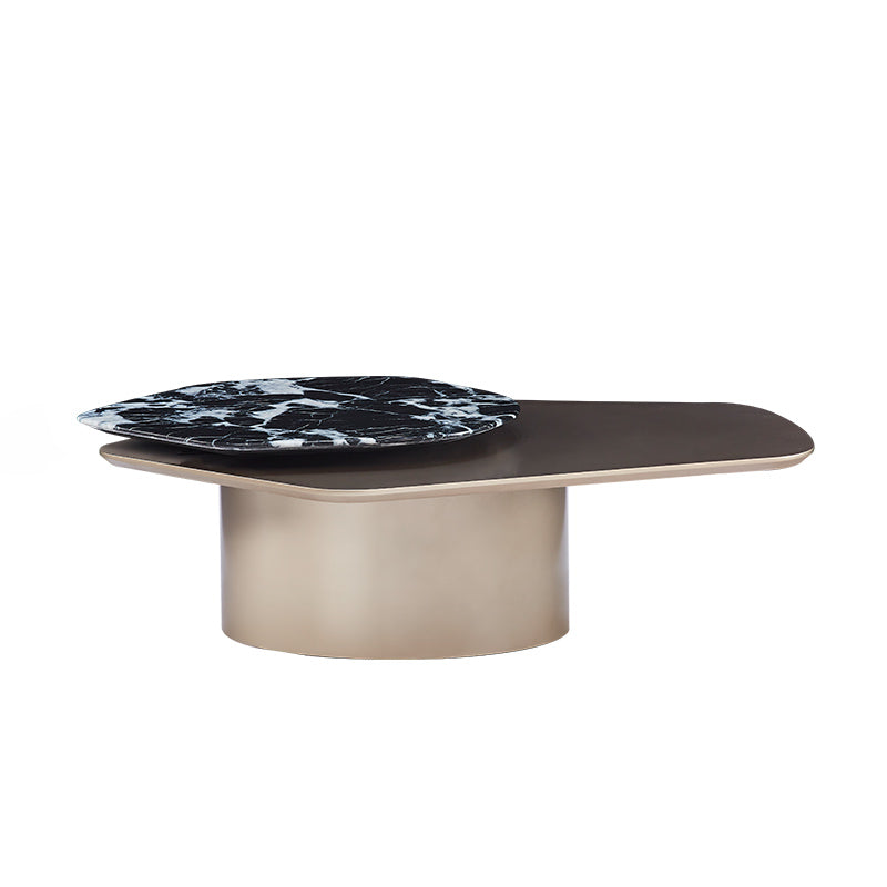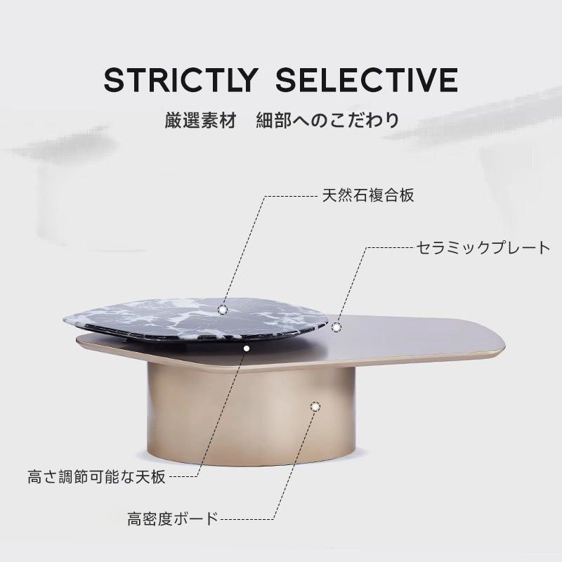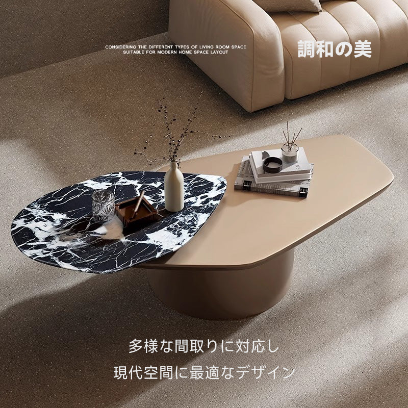 デザインセンターテーブルは、モダンで洗練されたデザインが特徴の高級感あふれる家具です。高密度ボードと天然石複合板を使用し、耐久性と高級感を兼ね備えた天板は、セラミックプレートで耐熱性と耐摩耗性に優れています。視覚的に魅力的な立体感を生むデザインと、安全な丸みを帯びた四隅が特徴です。傷つきにくく高温にも強い素材を使用し、お手入れも簡単で、食品にも安心して使用できます。小さいサイズと大きいサイズがあり、さまざまなリビングルームに調和します。安定性と耐久性の高い脚部がしっかりとした使用感を提供し、快適で上質な生活空間を演出します。