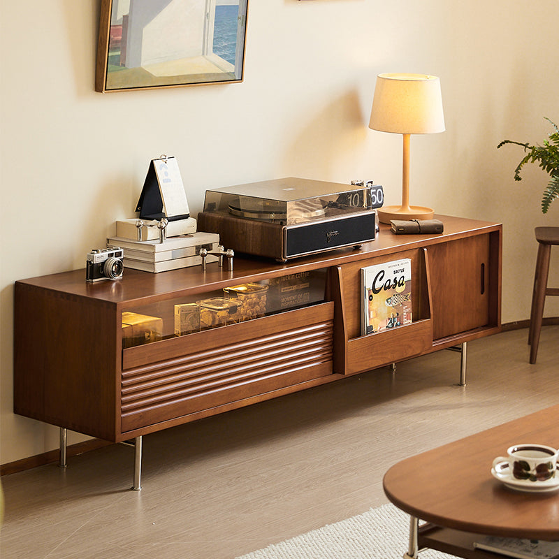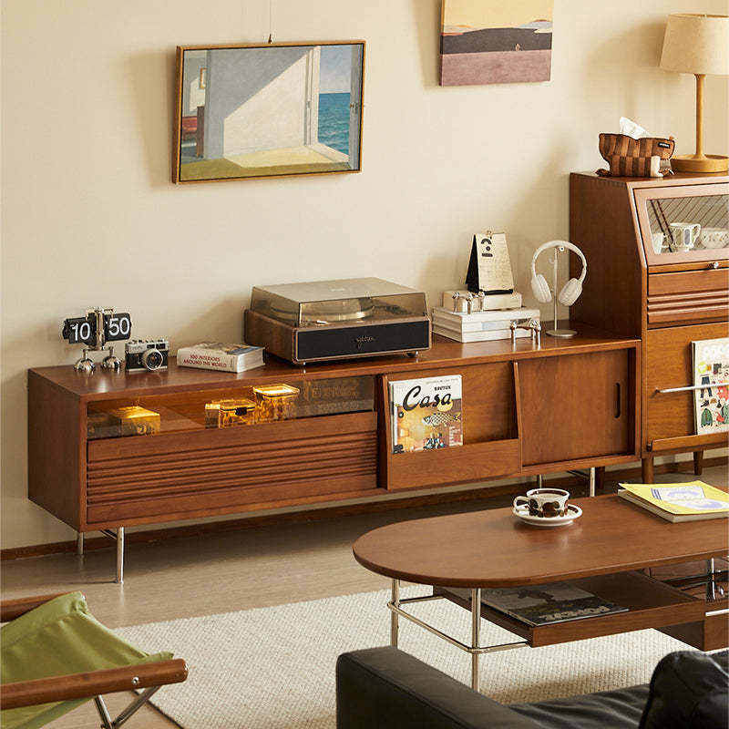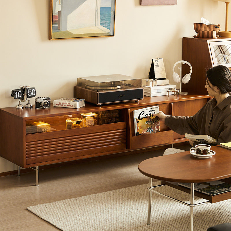 ツゲ材を使用した北欧多機能テレビボードは、シンプルで洗練されたデザインが特徴です。耐久性と高級感を兼ね備え、内外両用の収納エリアと大容量の引き出しで整理整頓が可能。レトロな魅力を引き立てるブラウンカラーと波模様のラインがクラシックな雰囲気を演出します。スライドドア設計でスペースを取らずにスムーズに開閉可能。180cmと210cmの2サイズ展開で、55〜75インチのテレビに対応。環境に優しい素材を使用し、安心して使用できる設計です。