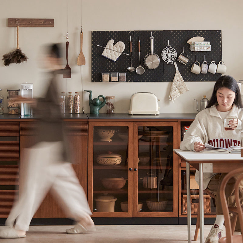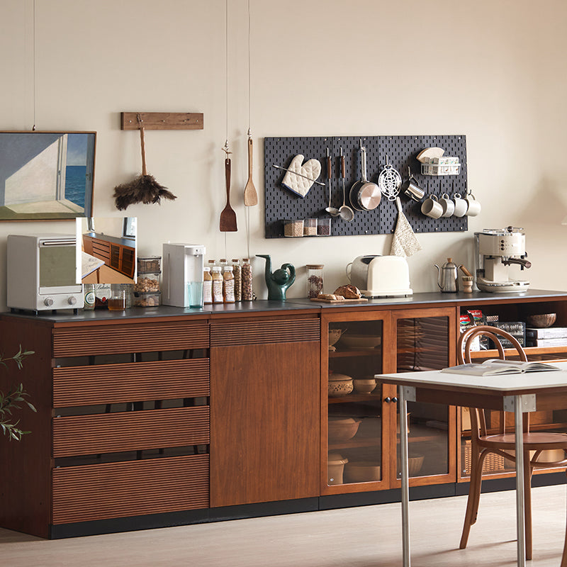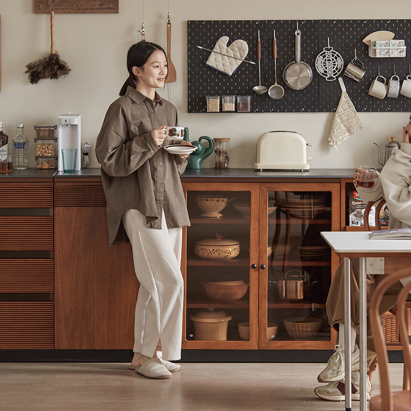 FAS級北米産ツゲ材を使用した高品質な木製家具です。モジュール式デザインにより、自由に組み合わせが可能で、多様なニーズに応えます。耐久性と美しさを兼ね備えたツゲ材と、耐熱性に優れたセラミック天板を採用し、キッチンやダイニング、ティー&コーヒーコーナーとしても活用可能です。ヴィンテージ風の落ち着いた色合いで、インテリアに上品さをプラス。安全設計で家族全員が安心して使用できます。