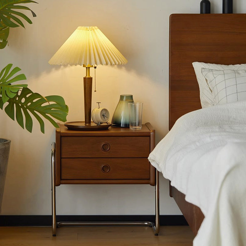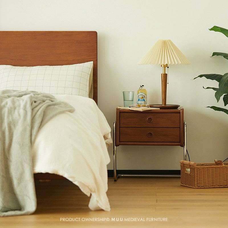 ツゲ材とステンレス脚が融合したベッドサイドキャビネットは、クラシックとモダンのデザインが特徴です。北米産FAS級ツゲ材を使用し、温かみのある木材の質感と繊細な木目が魅力的です。ステンレスの脚は耐久性に優れ、軽やかでスタイリッシュな見た目を演出。幅49cm、奥行35cm、高さ50cmのサイズで、2つの引き出しがあり、小物を整理するのに最適です。taihoペイントで仕上げられた塗装は耐久性と美しさを兼ね備えています。掃除機やお掃除ロボットもスムーズに使用可能なデザインで、日常生活に心地よさをプラスします。