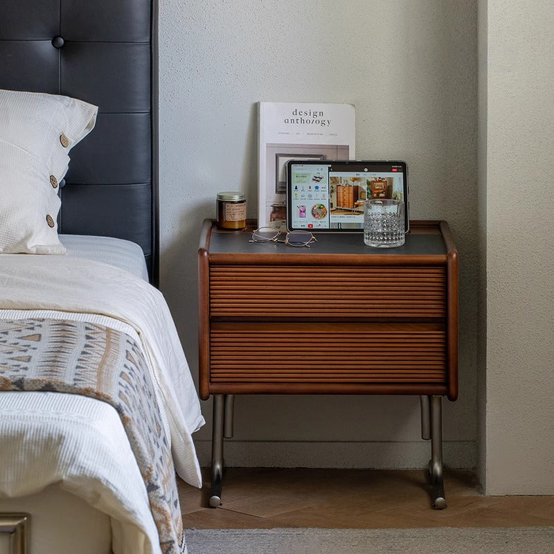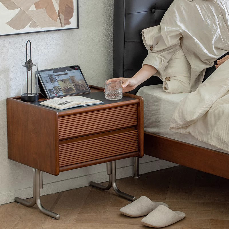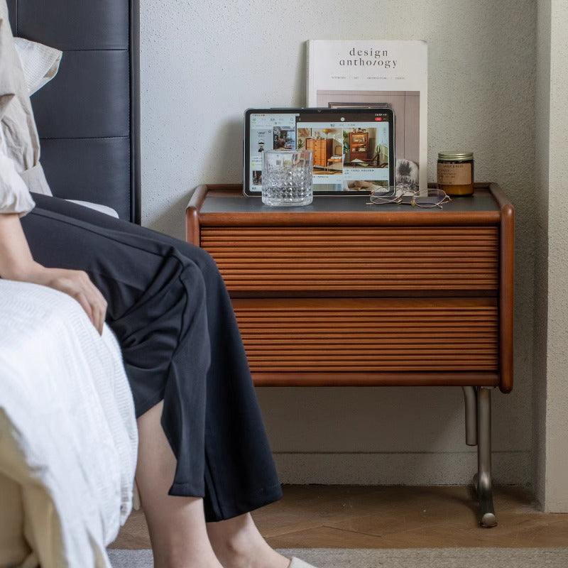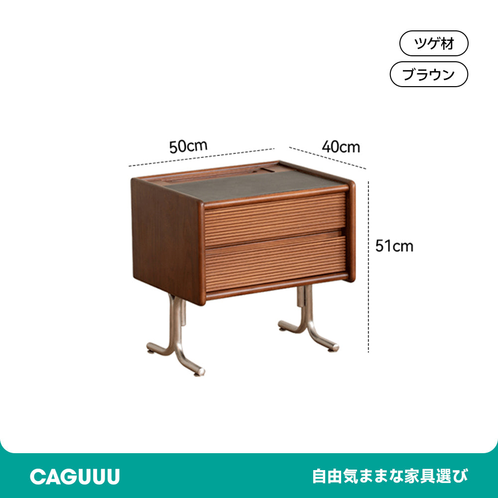 ツゲ材 T字脚ベッドサイドキャビネットは、FAS級ツゲ材を使用した高品質な家具で、耐久性と安定性に優れています。アンティークなデザインが特徴で、ブラックセラミックと金属脚を組み合わせたビンテージスタイルが魅力です。2つの引き出しで小物を整理し、天板にはスマホやタブレットの収納に便利なスリットがあります。背面にはケーブル穴があり、電子機器の充電に便利です。幅50cm、奥行40cm、高さ51cmのコンパクトサイズで、部屋のコーナーにぴったりフィットします。簡単組み立てで、すぐに使用開始可能です。