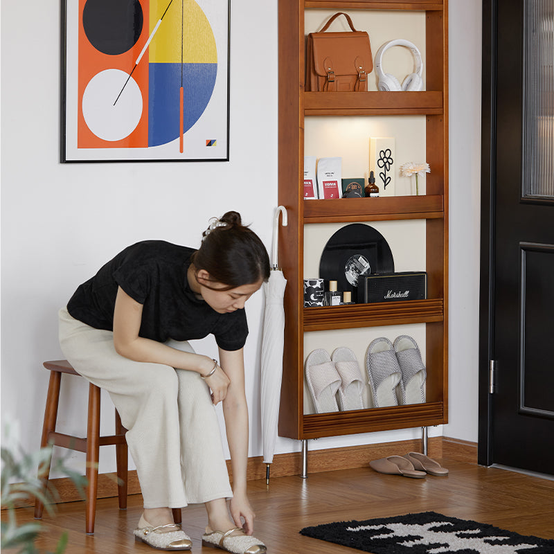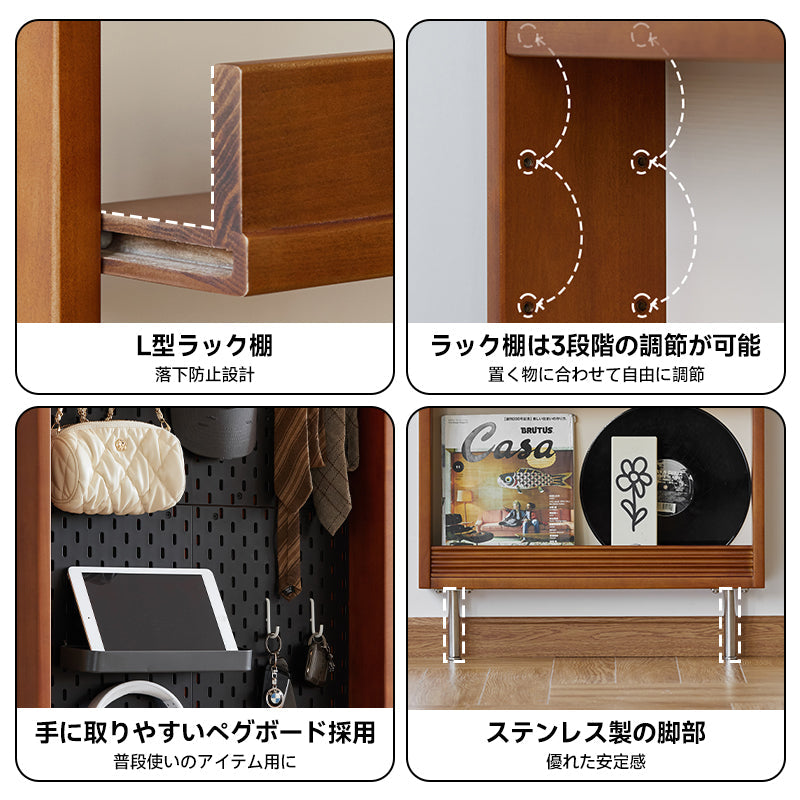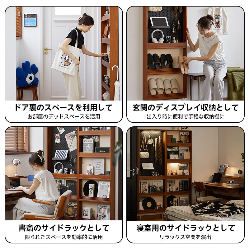 このツゲ材ディスプレイ式スリムラックは、北米産の高品質なFAS級ツゲ材を使用し、耐久性と美しさを兼ね備えています。幅11cmの超薄型デザインで限られたスペースを有効活用。玄関、リビング、寝室など多様なシーンで活用可能な多機能ラックです。省スペース設計、調整可能な棚、ペグボード式収納、安定したステンレス製脚部、L型ラック棚などの特長を持ち、日常の収納をより楽しく、便利にします。