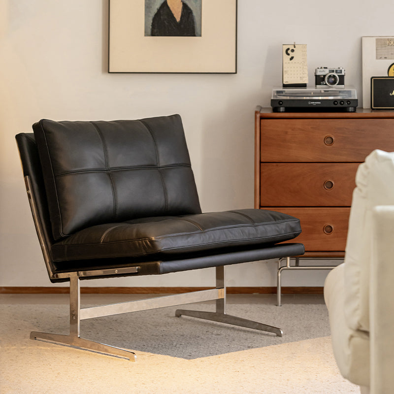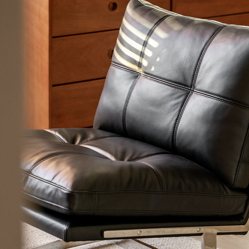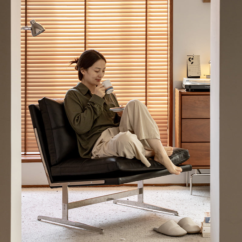 ラウンジシングルソファは、ミッドセンチュリースタイルを取り入れたシンプルでスタイリッシュなデザインが特徴です。フェイクレザーまたは本革を選べ、高反発ウレタンとグースダウン、PPコットンを使用した多層クッションが快適さを提供。ステンレスと合板のフレームで頑丈。レトロモダンスタイルが豊かな雰囲気を演出し、リビングルームに最適です。完成品でお届けし、すぐに使用可能。