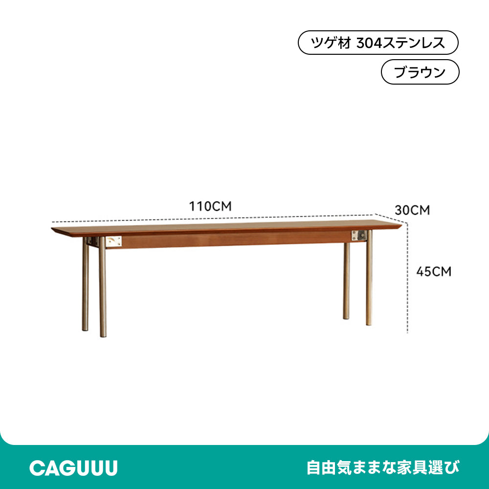 ツゲ材 ナチュラルスタイルウッドベンチは、北米産の高品質なFAS級ツゲ材を使用し、自然な木の色合いが温かみを感じさせます。110cmと130cmのサイズオプションがあり、スペースに合わせて選べます。頑丈な構造で、天板下には5cmの金属パーツで補強されており、安定感と耐久性を高めています。304ステンレススチールの金属製の脚は、防汚・防錆性に優れ、木材とのコントラストも美しいです。座面の厚さは2.1cm、幅は28cmで快適な座り心地を提供します。熟練した職人による多層塗装で、耐久性と美しさを兼ね備えています。ダイニングやリビング、玄関など様々なシーンで活用でき、組み立ても簡単です。