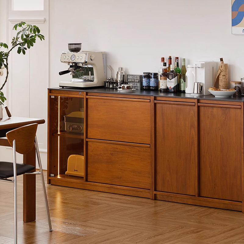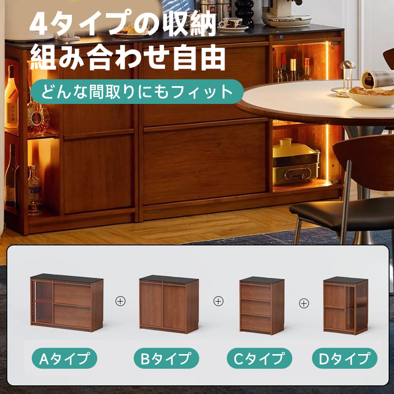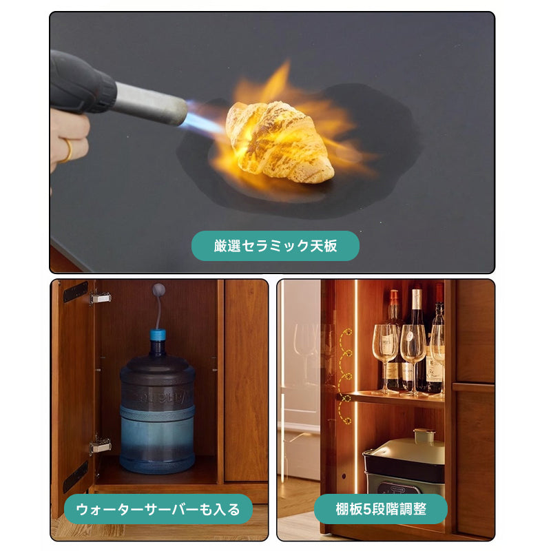 ツゲ材フレームデザイン木製ダイニングボードは、北米産FAS等級のツゲ材を使用し、上品で落ち着いた色合いが特徴です。セラミック天板は高温や傷に強く、耐熱性は1200℃まで対応。収納力も抜群で、A、B、C、Dの4タイプがあり、自由に組み合わせ可能。ウォーターサーバーの収納も可能で、隠し配線設計が施されています。調整可能な棚板や埋め込み式LEDライト、静音レールなど、機能性と美しさを兼ね備えたデザインで、どんなインテリアにもマッチします。