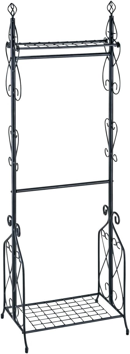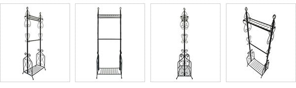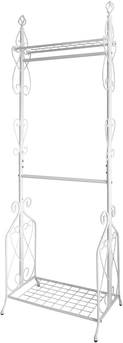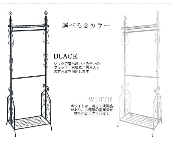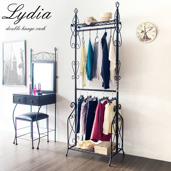 ヴィンテージ風ダブルハンガーラック「Lydia」は、美しいロートアイアンデザインが特徴のスタイリッシュな収納アイテムです。ブラックとホワイトの2色展開で、お部屋の雰囲気に合わせて選べます。2段式のハンガーラックで、トップスやボトムスを分けて収納可能。高強度のスチール製で耐久性・耐荷重性に優れ、アジャスター付きで床の凹凸にも対応可能です。組み立ては簡単で、約15分で設置できます。おしゃれで機能的な収納をお求めの方に最適です。