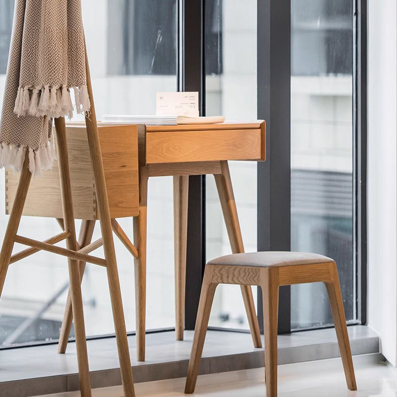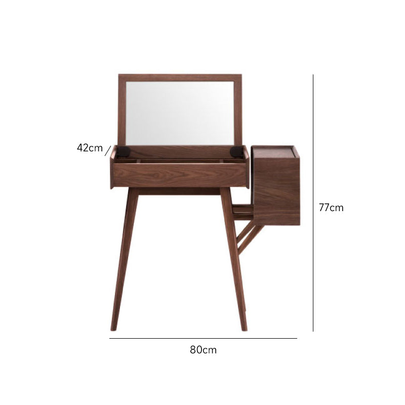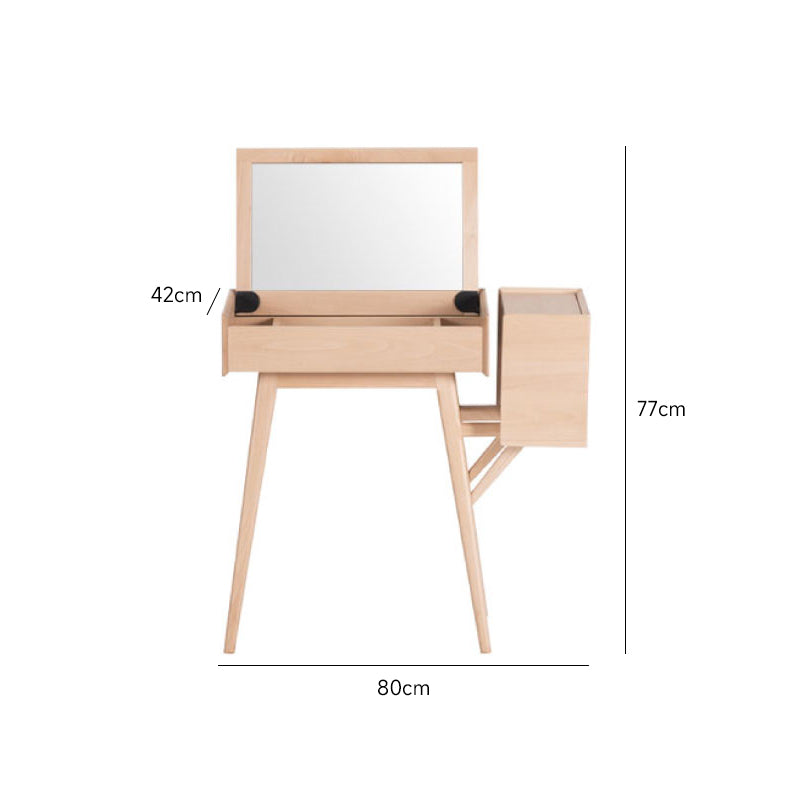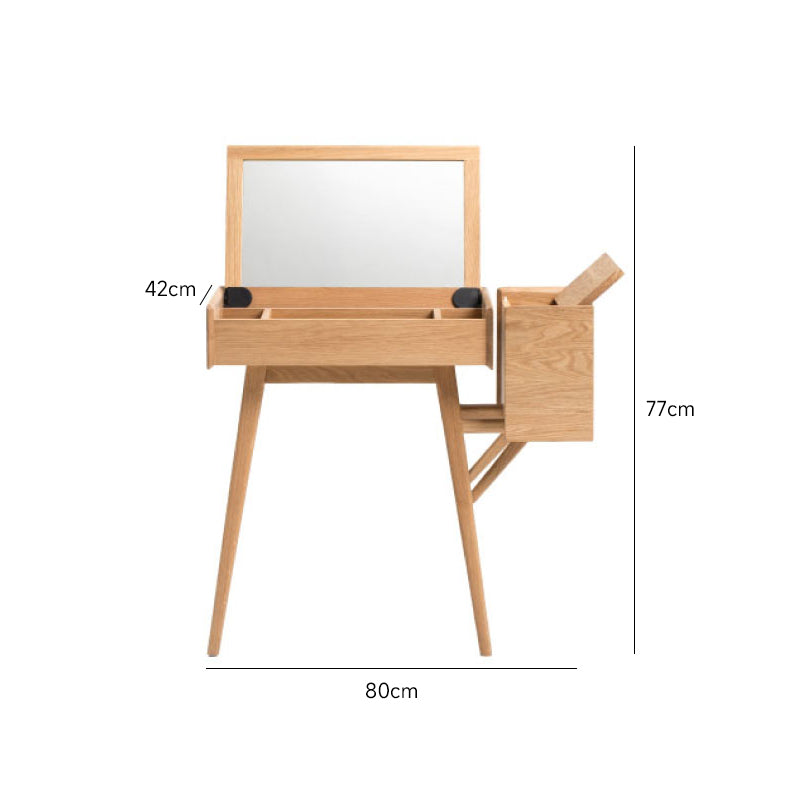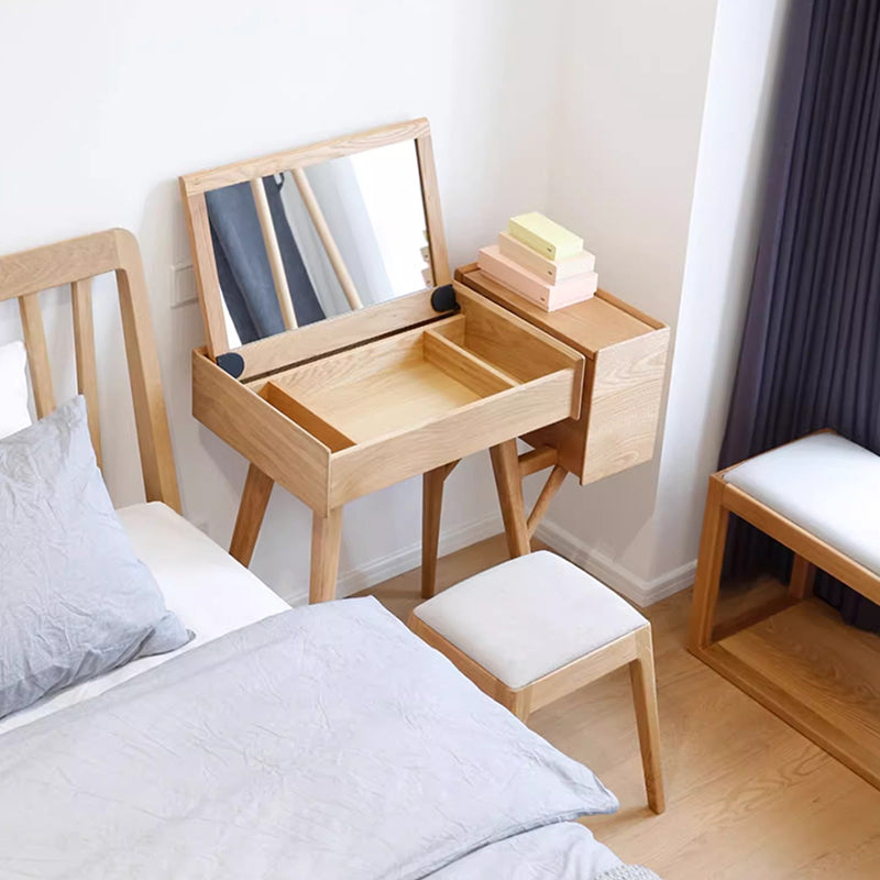 収納付きベッドサイドドレッサーは、コンパクトなサイズでベッドサイドにぴったりフィット。ブラックウォールナット、ホワイトオーク、ブナ材の選択肢があり、デザイン性と機能性を兼ね備えた一品です。2つの収納ボックスで化粧品やアクセサリーを整理しやすく、使いやすいミラーはフラットに収納可能。ダンパー付きで静音設計、ほぞ継ぎ接合で美しさと安定感をプラス。おしゃれなインテリアとしても最適です。