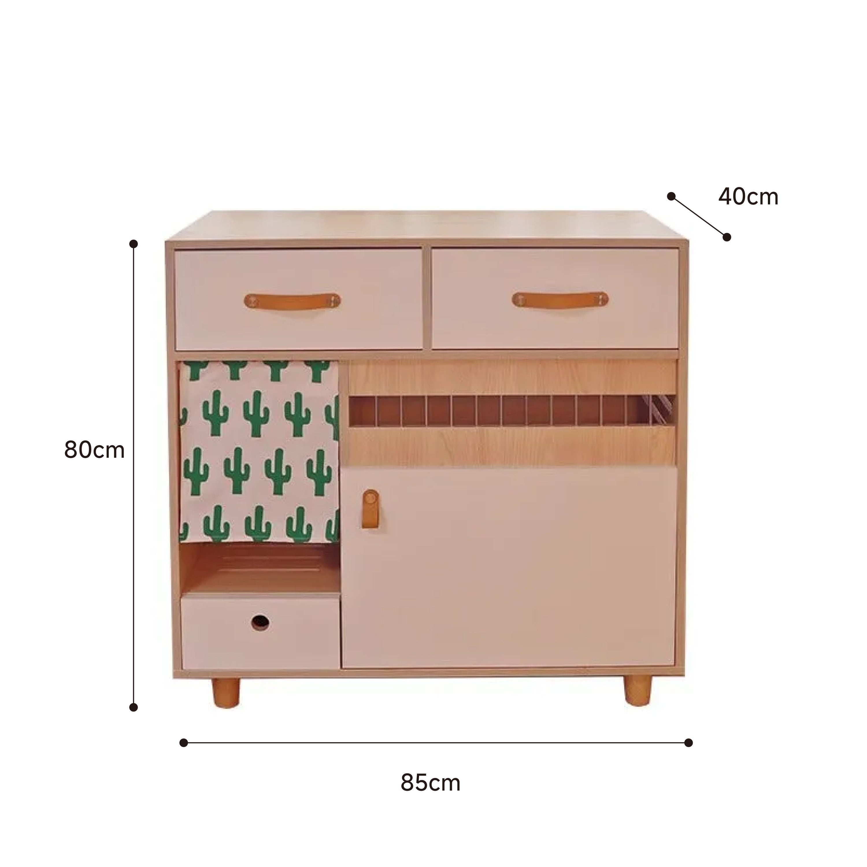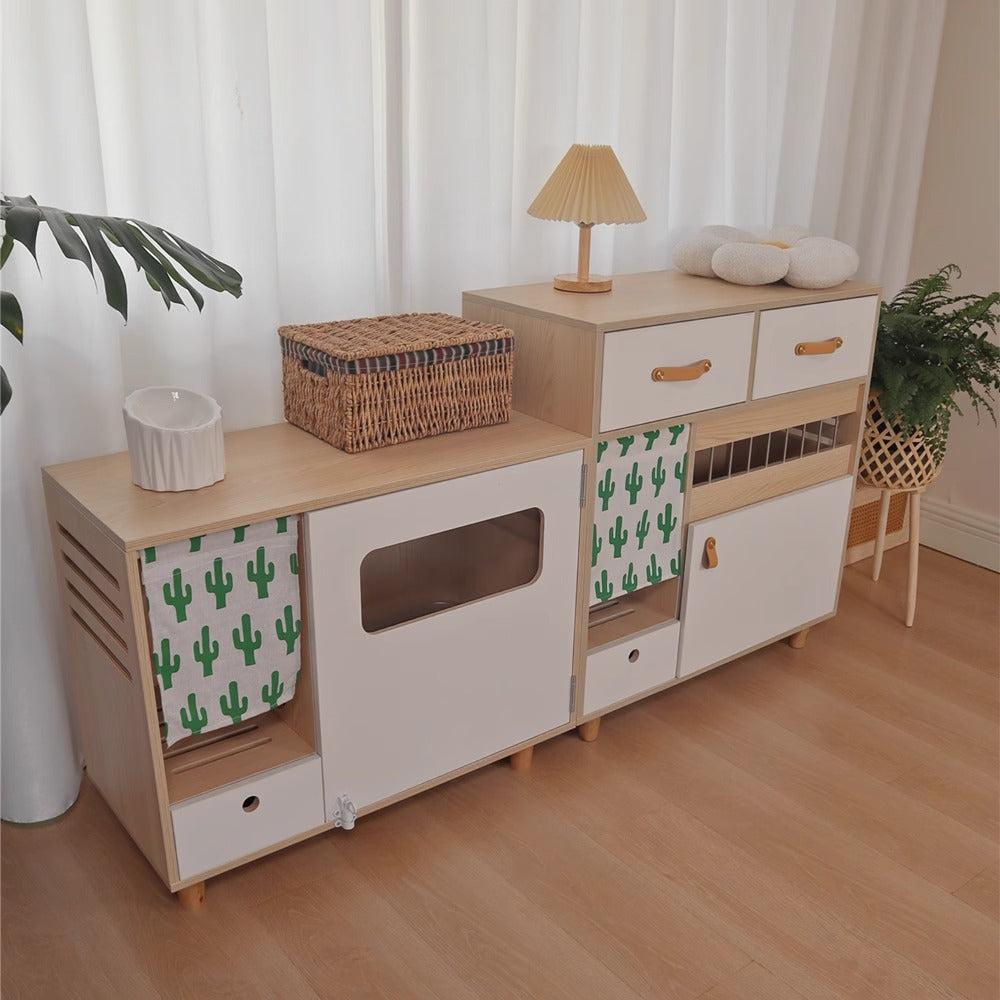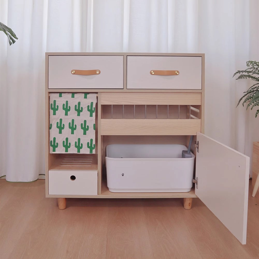 猫トイレ付き収納キャビネットは、ペットと暮らす空間をスタイリッシュに整える理想的な家具です。猫トイレを隠しつつ収納機能を兼ね備えたデザインで、シンプルでモダンな外観が特徴です。高品質な合板とステンレス製の蝶番、牛皮製のハンドルを使用し、耐久性とデザイン性を兼ね備えています。無臭で安全な素材を使用し、ペットと人間に優しい設計です。幅85cm、高さ80cm、奥行き40cmのコンパクトなサイズで、様々なスペースにフィットします。
