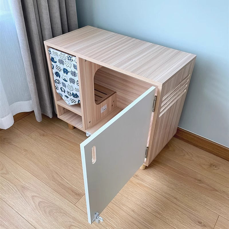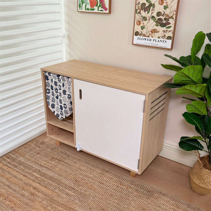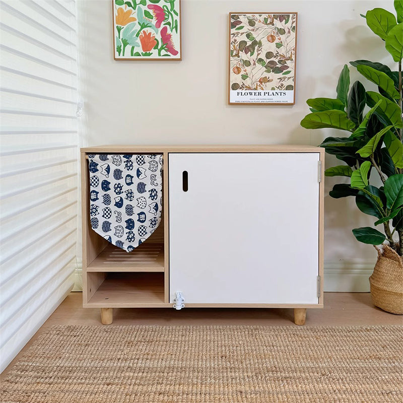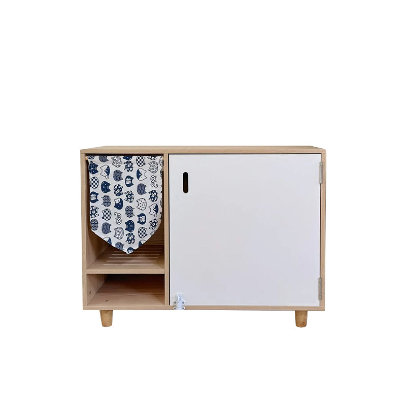 このコンパクト猫トイレキャビネットは、スタイリッシュで機能的なデザインが特徴です。ナチュラルブラウンの合板で作られたこのキャビネットは、どんなインテリアにもマッチします。高品質な合板とABS特許素材木を使用し、耐久性に優れ、爪傷にも強いです。MサイズとLサイズの2種類があり、猫が快適に使用できる広い出入り口を備えています。扉は簡単に開閉でき、掃除がしやすい設計です。天然木のキャビネット脚やかわいらしい柄のカーテンが付属し、猫のトイレをおしゃれに隠しつつ、使いやすさを兼ね備えた優れた選択肢です。