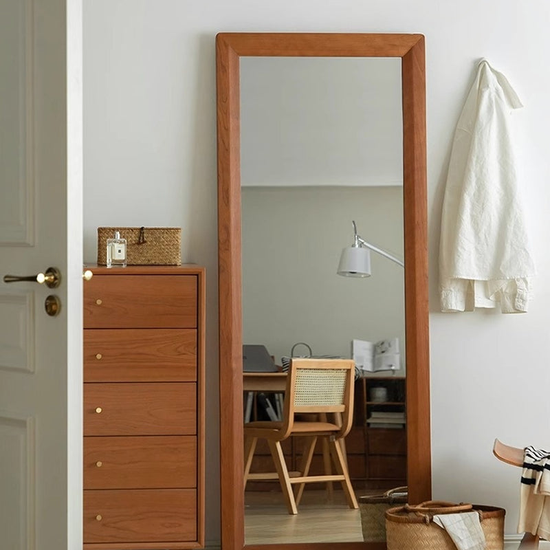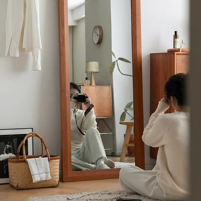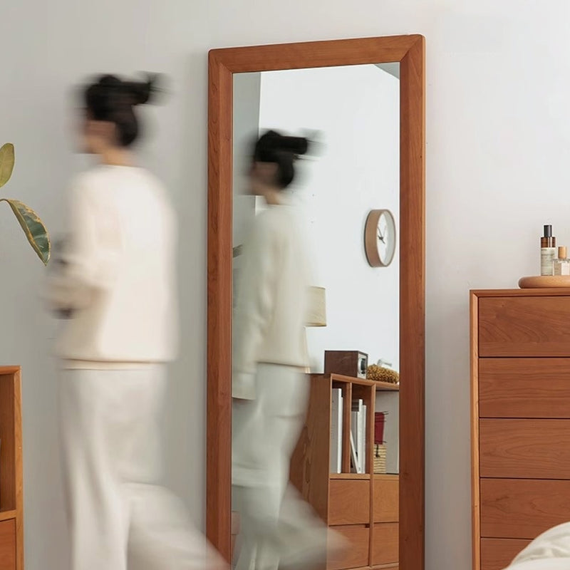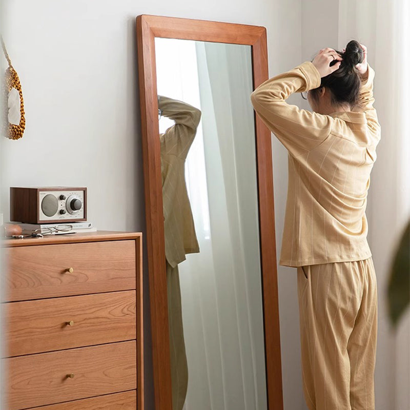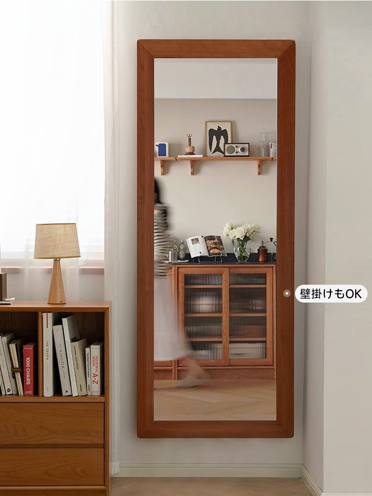 チェリー材 ナチュラルミラースタンドは、北米産FASグレードの高級チェリー材を使用したスタンドミラーです。自然なブラウンの色合いがどんなインテリアにも調和し、リビングや寝室、ドレッサーとしても最適です。頑丈で洗練されたフレームは耐久性に優れ、大きなミラーは全身を映し出します。多機能性により、床置きや壁掛けが可能で、省スペースで掃除も楽々。安全性を考慮し、飛散防止フィルムが施されています。カップルやファミリー向けにぴったりの高級木材シリーズとして、上質な空間を演出します。