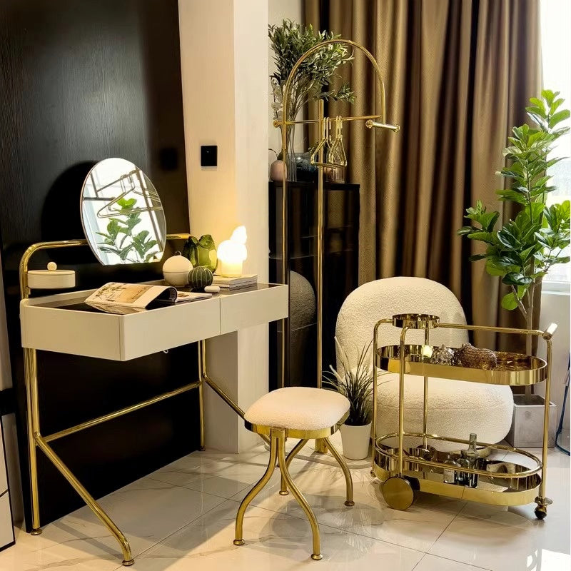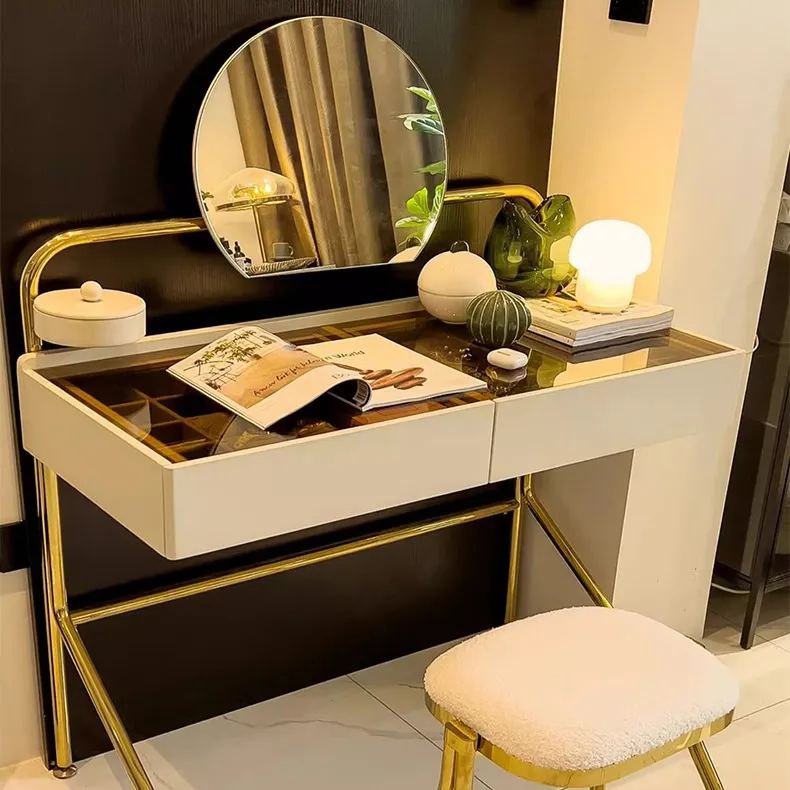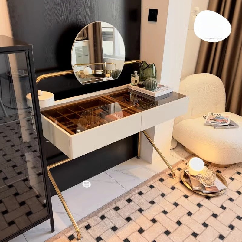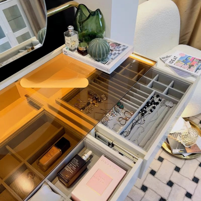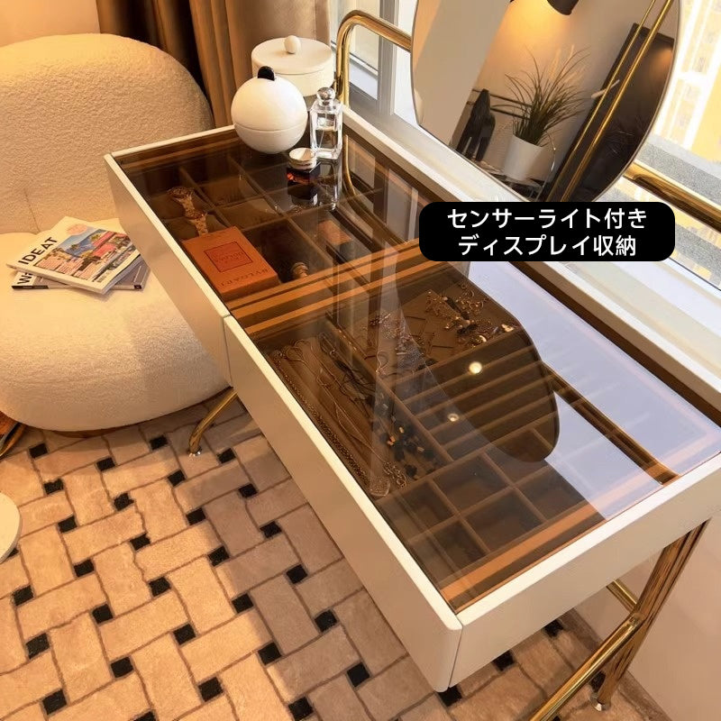 ガラス天板モダンドレッサーチェアセットは、洗練されたデザインと機能性を兼ね備えた理想的な選択です。強化ブラウンガラスの天板、内蔵LEDライト付き大容量収納、ステンレススチールとMDF板の高品質素材、角度調整可能なミラー、上質なブークレ生地のチェアが特徴です。優美なラインでどんなインテリアにもマッチし、ホルムアルデヒド不使用の塗料で健康にも配慮されています。上品で贅沢な空間を演出し、日常の美しさと機能性を高めます。