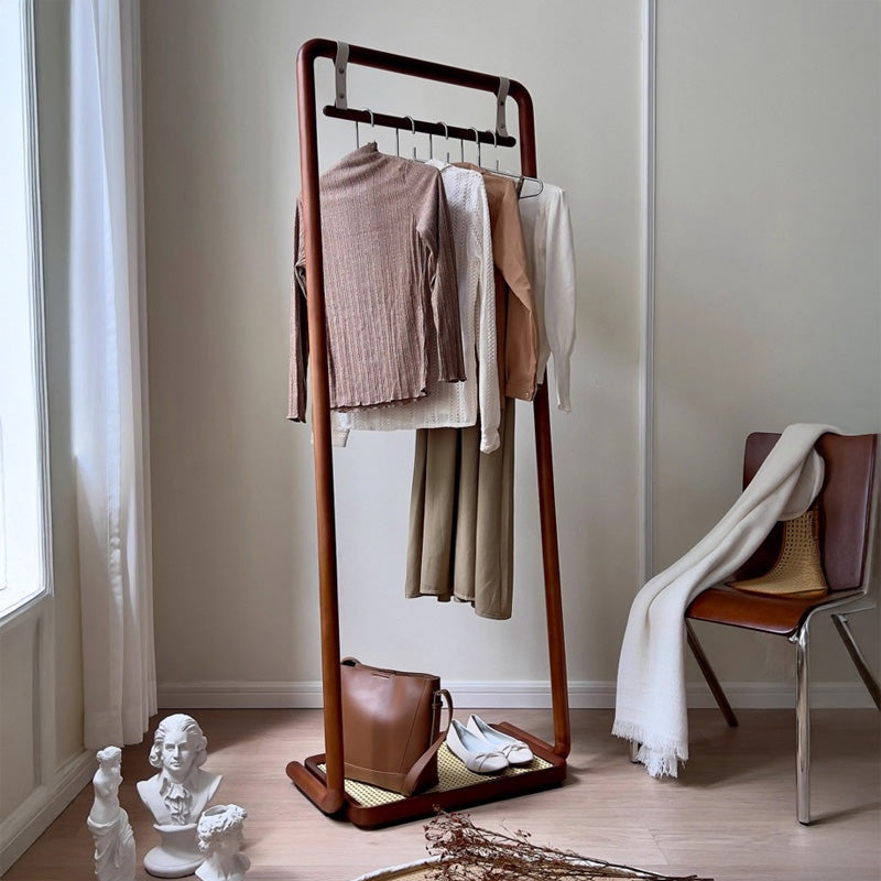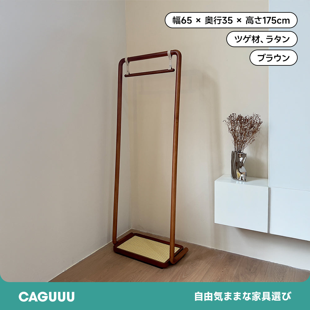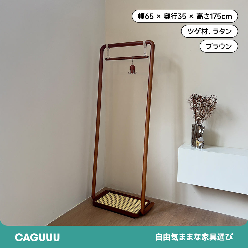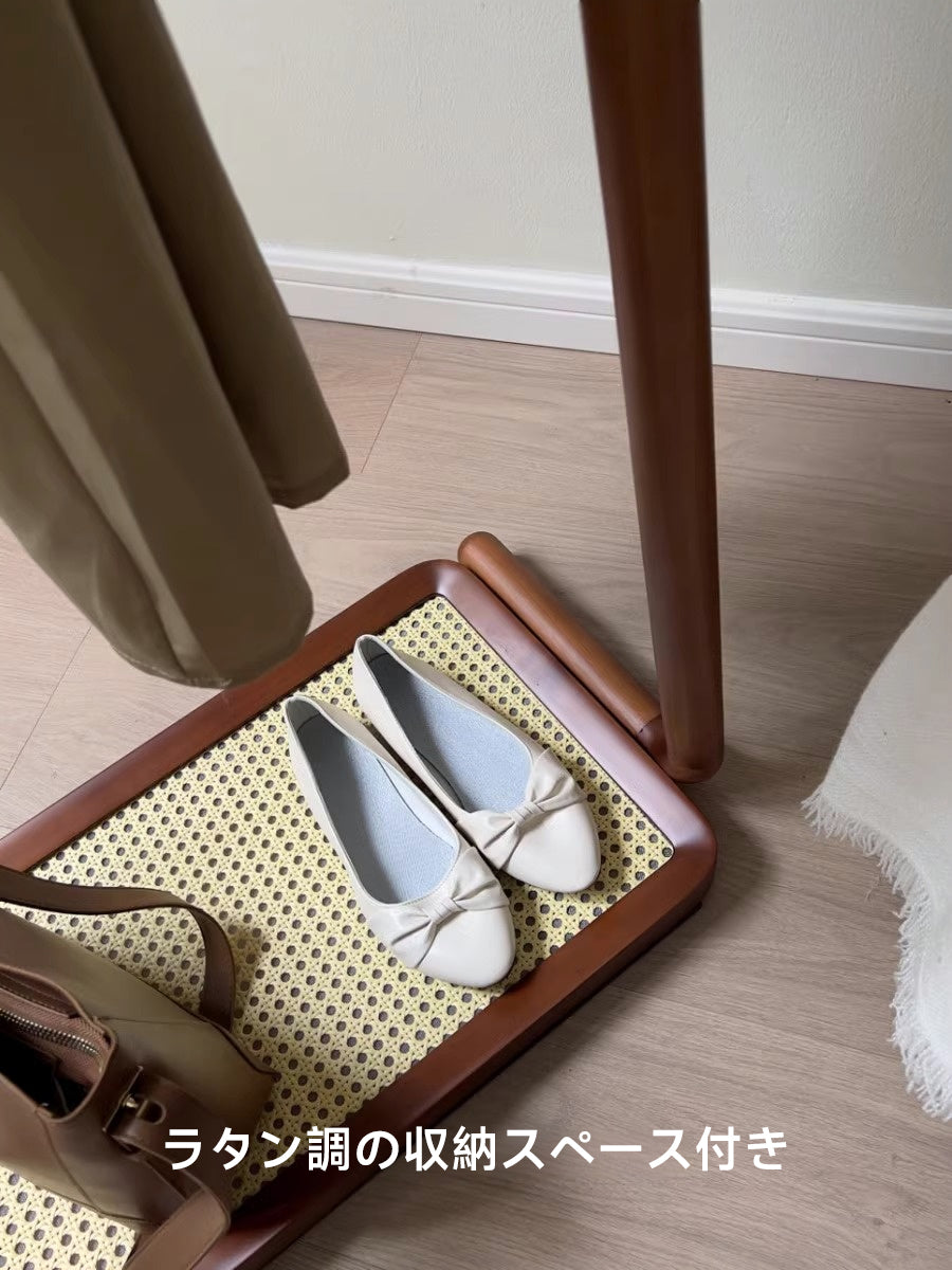 大容量木製ハンガーラックは、北米産のツゲ材を使用し、環境に優しい水性ニスで仕上げられたエコフレンドリーな製品です。シンプルで安定性に優れたデザインで、幅広いインテリアにマッチします。高さ175cmのため、ロングスカートも余裕で掛けられます。足元にはバッグや靴を収納できるスペースがあり、ラタン調のデザインが美しさと耐久性を兼ね備えています。玄関やリビング、寝室など様々な場所で使用可能です。底部の金属部品が安定性を高め、斜めに傾斜したL字型の作りが特徴です。乾いた布でさっと拭くだけで簡単にお手入れできます。