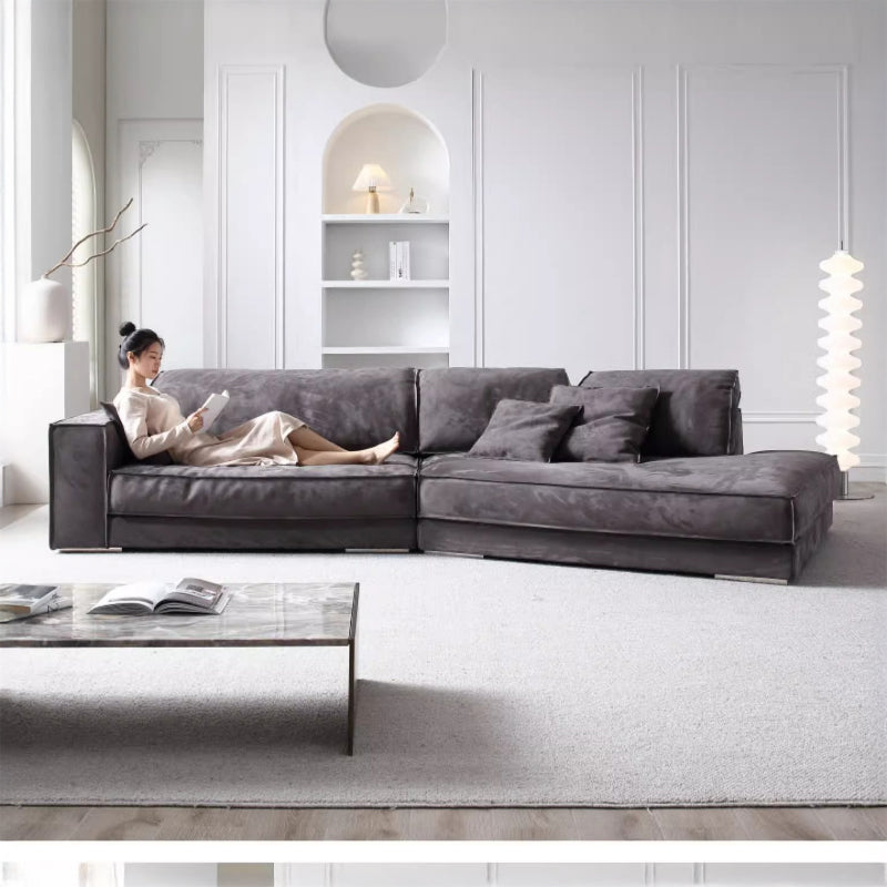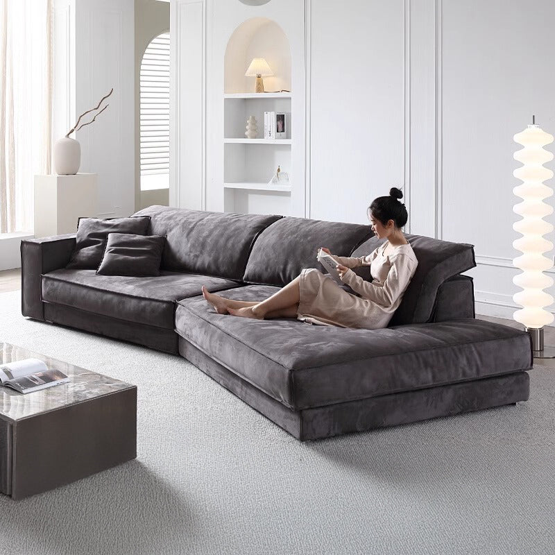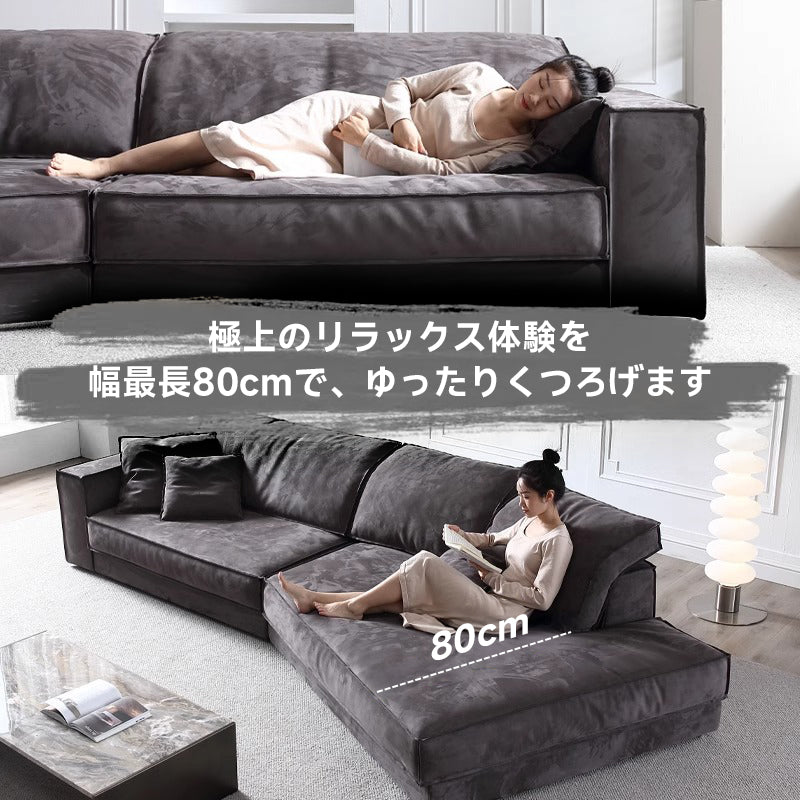 スエード調ワイドコーナーソファは、贅沢なリラックス体験を提供するために設計されています。フランネル生地を使用し、極上の肌触りと滑らかな手触りを実現。高密度の極細繊維が耐久性と通気性を高め、ホルムアルデヒドフリーでペットやお子様にも優しい設計です。幅広の座面とゆったりとした奥行きで自由自在なリラックススタイルが楽しめます。ダウンとウレタンのW構造が体をしっかりサポートし、理想的なフィット感を提供。3層構造の座面には高強度のスチールスプリングを使用し、安定性と耐久性を確保しています。多様なサイズオプションがあり、リビングの広さに合わせて選べます。