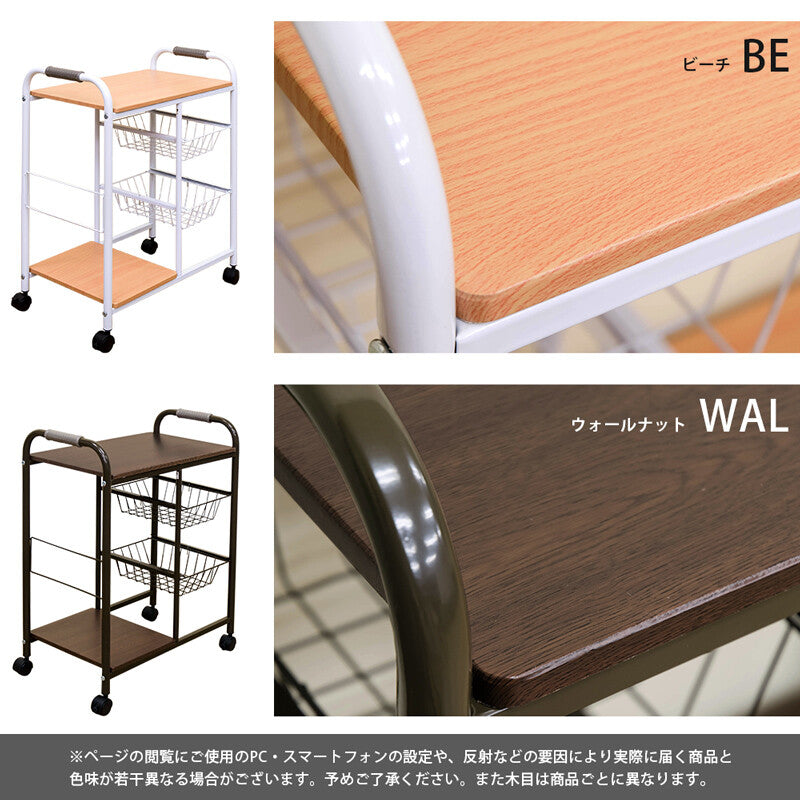 ベーシックデザインスチールフレームカゴ・棚付キッチンワゴンは、シンプルで機能的なデザインが特徴です。スチールフレームで頑丈、長持ちし、ウォールナットとビーチの2色から選べる木目調の天板と棚板が魅力。収納力に優れ、2つのワイヤーバスケットと追加の棚で食材や調理器具をすっきり収納。キャスター付きで移動も簡単、ストッパー機能で安定性も抜群。幅約51.5cm、奥行き約34cm、高さ約72cmのコンパクトサイズで、家庭の様々なシーンで活躍します。