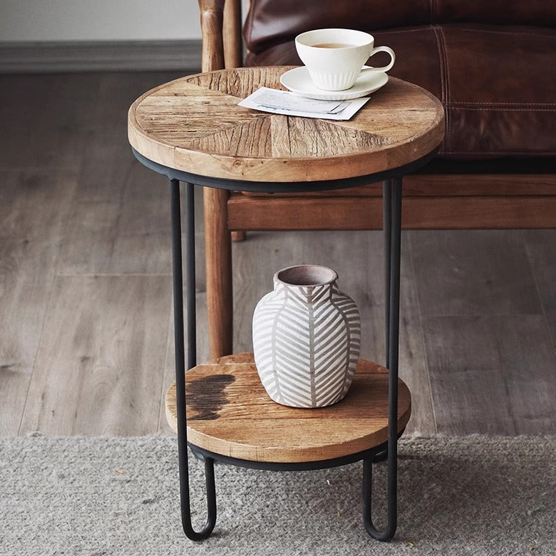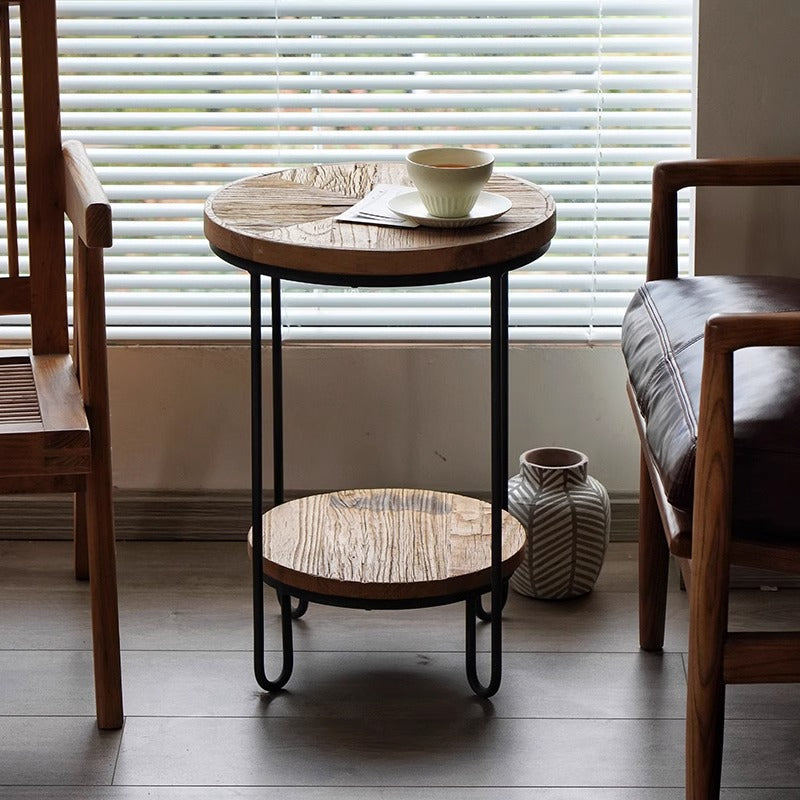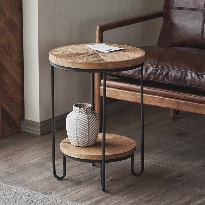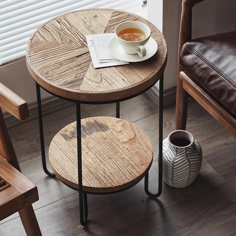 天然木ラウンドラックテーブルは、ニレ古材を使用した独特の木目と質感が魅力のデザイン性と実用性を兼ね備えた逸品です。環境に優しい天然オイル仕上げで、表面の硬度を高め、防水・防汚効果を発揮します。二段構造で収納力が高く、スチール脚の耐久性と安定感が特徴です。コンパクトなサイズでどんな空間にも自然に馴染み、リビングやサンルーム、バルコニー、寝室など様々な場所で使用可能です。職人の技が光る高品質な仕上げで、長く愛用できるテーブルをお探しの方に最適です。