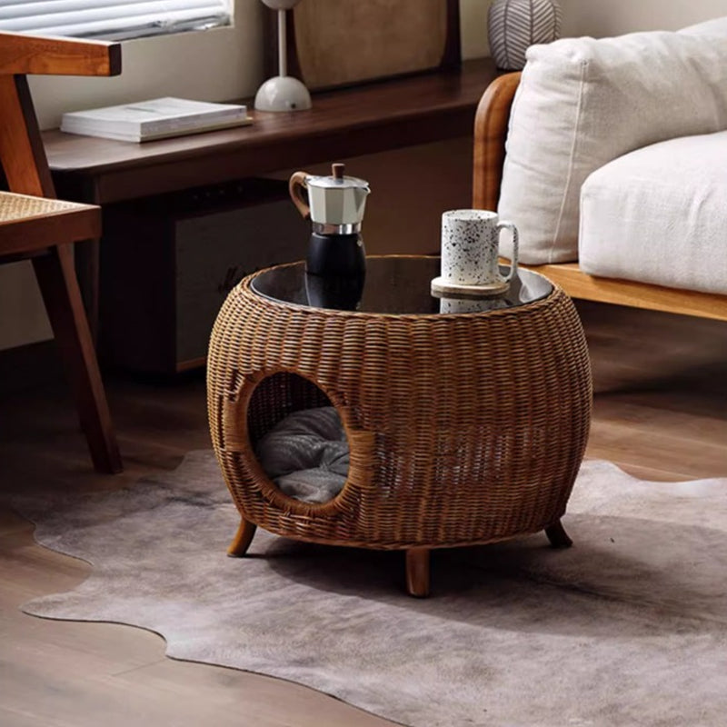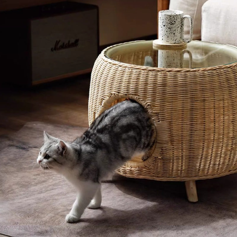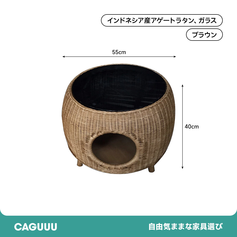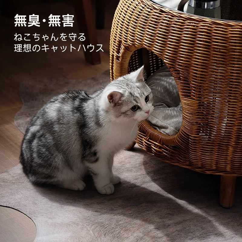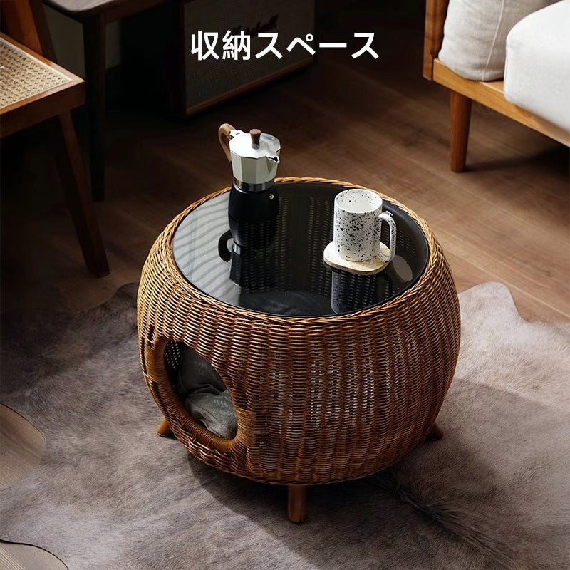 ラタン製キャットハウスサイドテーブルは、猫と共に快適に過ごせる多機能家具です。高品質なインドネシア産ラタンを使用し、耐久性と防水性に優れています。シンプルでお部屋のアクセントになるデザインが特徴です。猫のためのハウスとしても、サイドテーブルとしても使用可能で、収納スペースも備えています。通気性抜群で、猫が快適に過ごせる空間を提供します。サイズは幅55cm、奥行55cm、高さ40cm、穴のサイズは幅20cm、高さ20cmです。