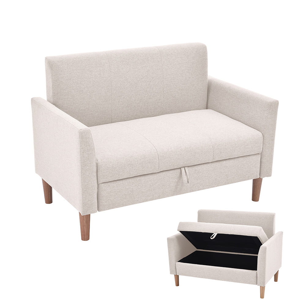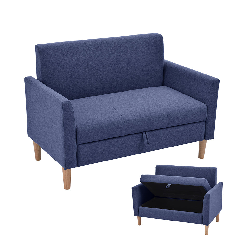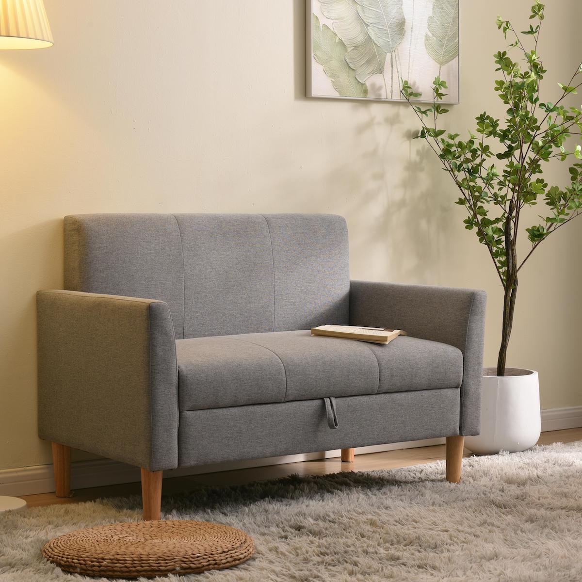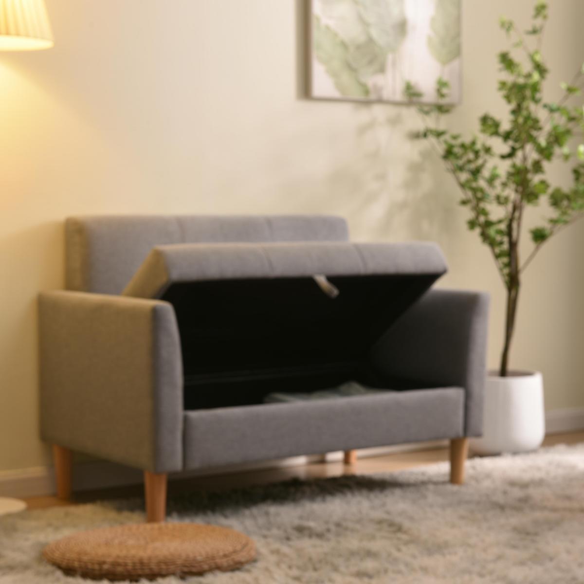 収納付き2人掛けソファーベッドは、機能性とデザイン性を兼ね備えた理想的な家具です。座面下の収納スペースでブランケットや雑誌をすっきりと整理でき、取っ手付きで簡単に開閉可能です。少し硬めのクッションで快適な座り心地を提供し、長時間座っても疲れにくい設計です。取り外し可能な脚は、掃除の際にも便利で、傷防止フェルト付きで床を守ります。幅1060mm、奥行き620mm、高さ755mmのサイズで、グレー、ブルー、グリーン、ブラウン、アイボリーの5色展開。限られたスペースを有効活用したい方やスタイリッシュなインテリアを求める方に最適です。