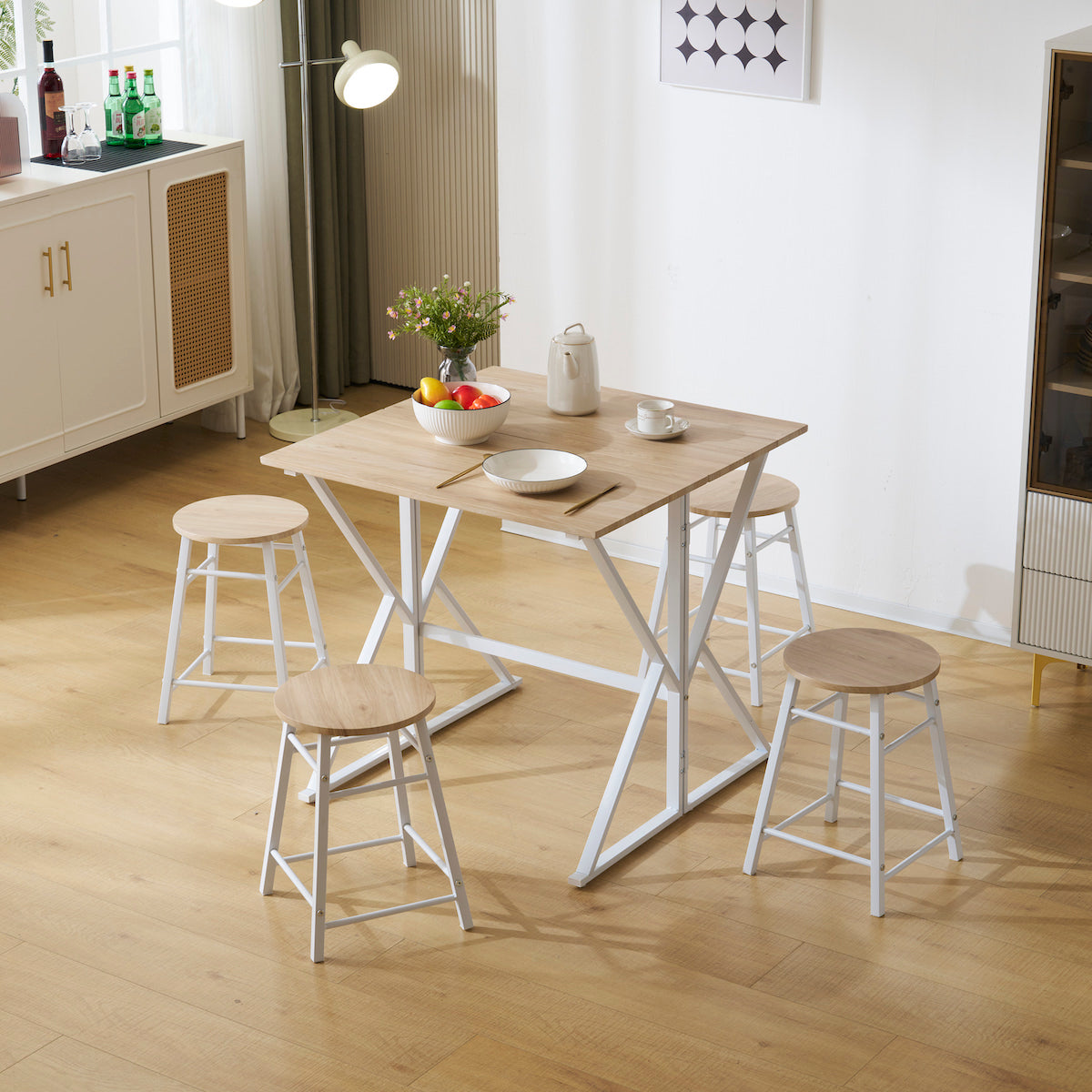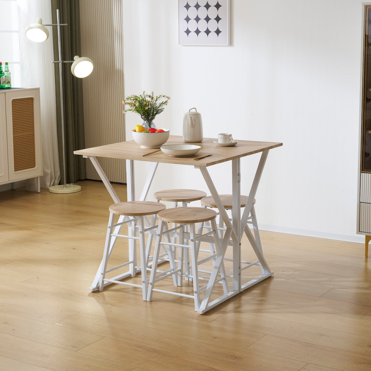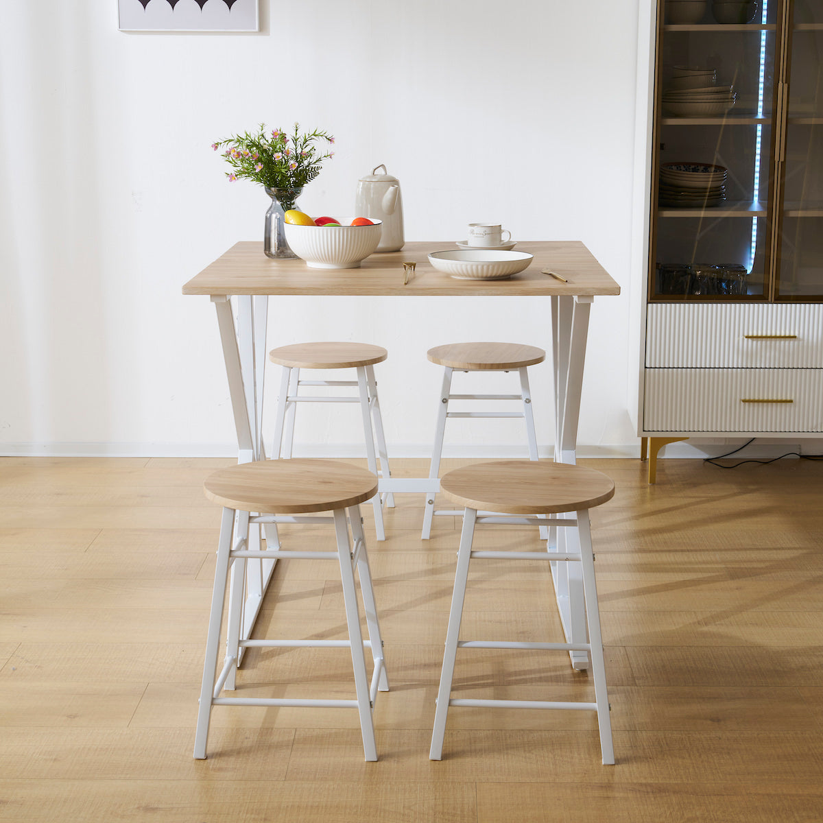 このスチール製ダイニングテーブル5点セットは、モダンでスタイリッシュなデザインが特徴です。耐久性のあるスチールフレームと木目調の天板がシンプルで洗練された外観を演出し、コンパクトなサイズでありながら十分なスペースを提供します。軽量スツールは移動が簡単で、テーブルの下にすっきりと収納可能です。小さなダイニングスペースやキッチンに最適で、家族や友人とのカジュアルな食事にぴったりです。機能性とデザイン性を兼ね備えたこのセットで、日常の食事をより快適に、そしてスタイリッシュに演出します。