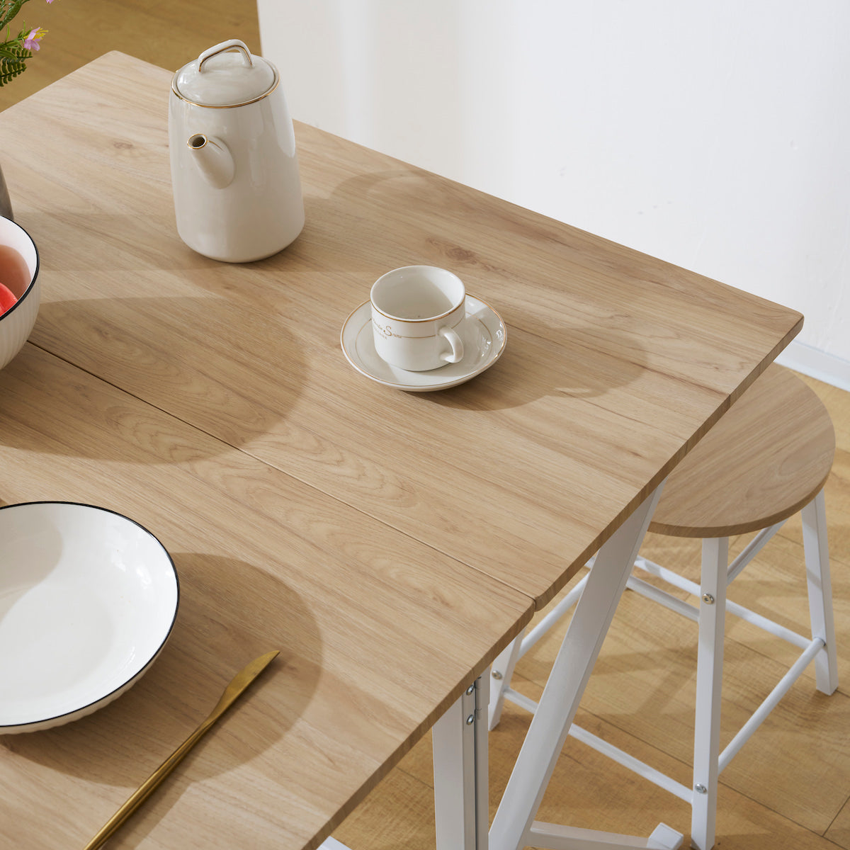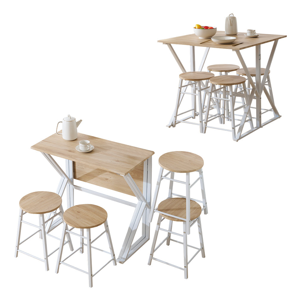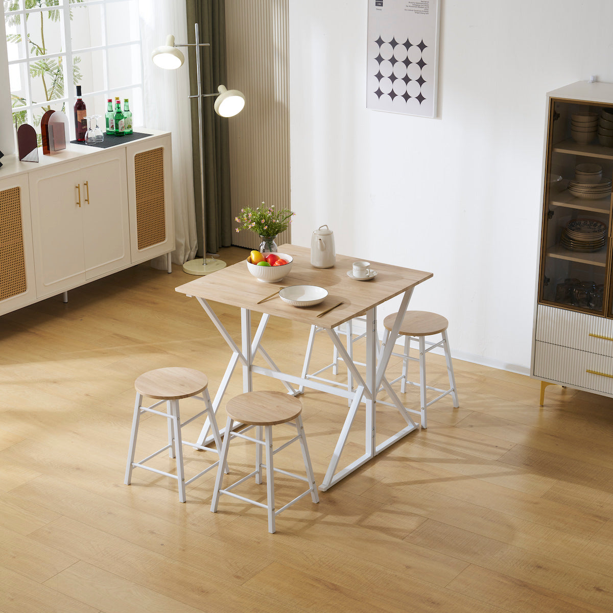 このスチール製ダイニングテーブル5点セットは、モダンでスタイリッシュなデザインが特徴です。耐久性のあるスチールフレームと木目調の天板がシンプルで洗練された外観を演出し、コンパクトなサイズでありながら十分なスペースを提供します。軽量スツールは移動が簡単で、テーブルの下にすっきりと収納可能です。小さなダイニングスペースやキッチンに最適で、家族や友人とのカジュアルな食事にぴったりです。機能性とデザイン性を兼ね備えたこのセットで、日常の食事をより快適に、そしてスタイリッシュに演出します。