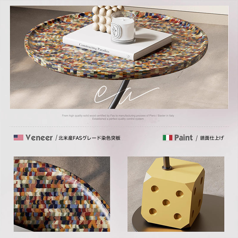 カラフルサイドテーブルは、ユニークでスタイリッシュなデザインが特徴の高品質テーブルです。北米産FASグレードの染色突板を使用し、環境に優しい仕上がり。天板は色とりどりのモザイク模様で、空間に彩りを添えます。サイズは45cm x 45cm x 50cmで、リビングルームやオフィスなど多様な空間に適しています。耐久性に優れた設計で、長く愛用できるアイテムです。簡単に組み立てられるため、すぐに使用開始可能。洗練されたライフスタイルを体現し、インテリアに個性をプラスします。